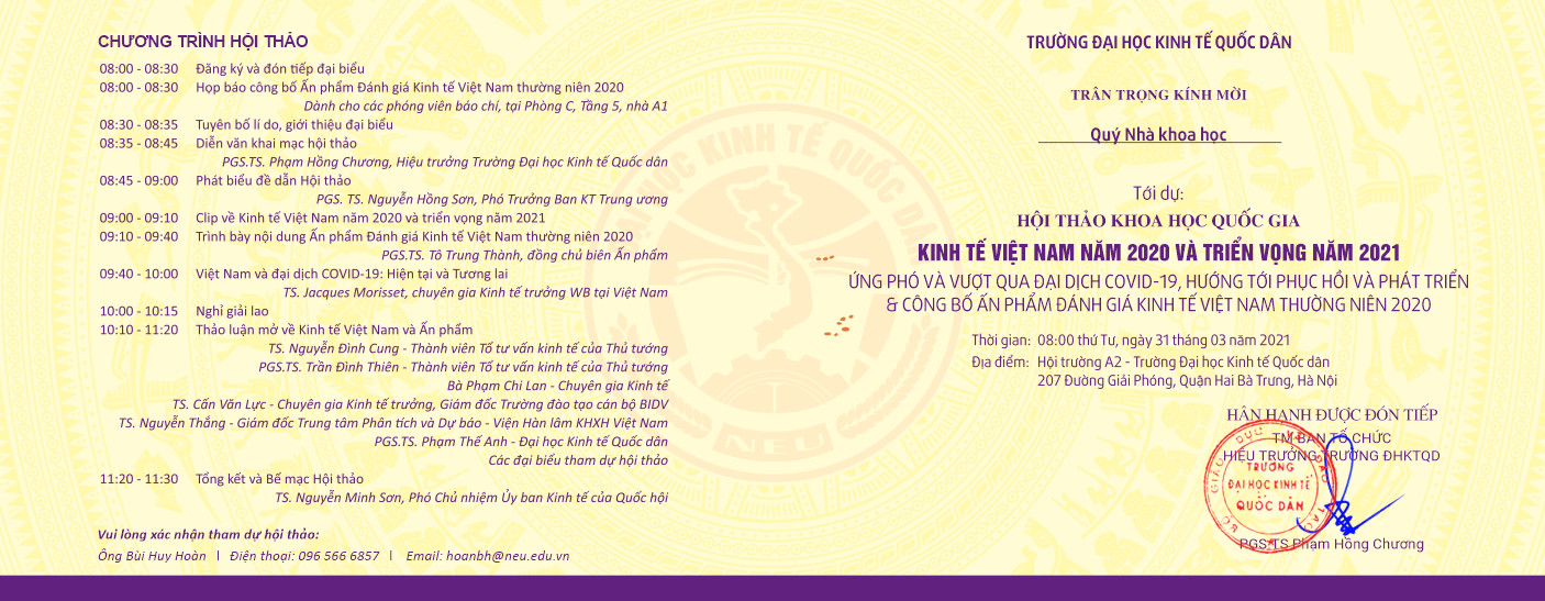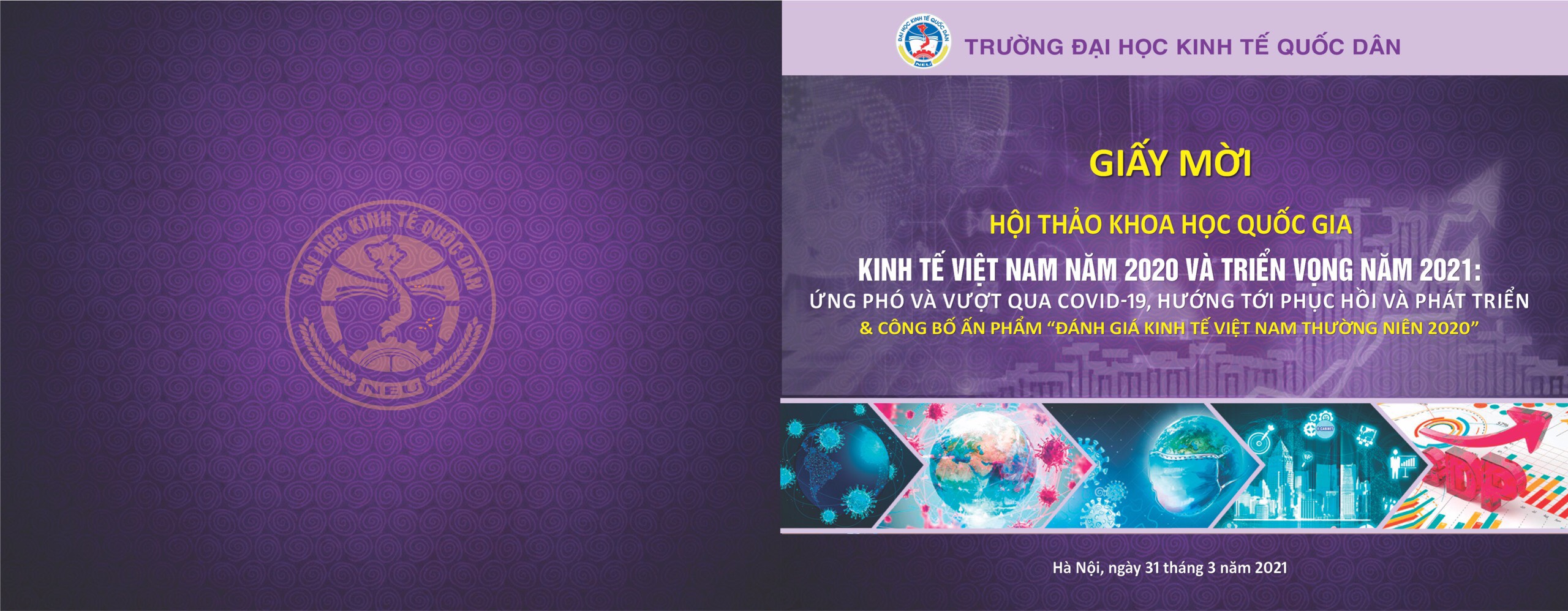 27/03/2021 2021-03-27 14:45Giấy mời tham dự Hội thảo KHQG: Kinh tế Việt Nam năm 2020 và triển vọng năm 2021: “Ứng phó và vượt qua đại dịch COVID-19, hướng tới phục hồi và phát triển” & Công bố Ấn phẩm Đánh giá Kinh tế VN thường niên 2020