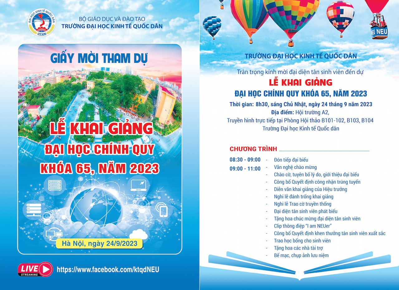 Hoà cùng niềm hân hoan chào đón Tân sinh viên K65 và trao thưởng cho các sinh viên xuất sắc, Trường Đại học Kinh tế Quốc dân trân trọng kính mời Quý thầy cô, Quý phụ huynh và các em sinh viên tham dự Lễ Khai giảng Đại học chính quy Khoá 65, năm 2023.