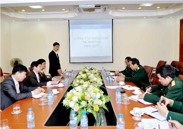 Buổi làm việc đã diễn ra trong bầu không khí thân mật, thắm đượm tình hữu nghị. Trong phát biểu, GS.TS Phạm Quang Trung bày tỏ vui mừng khi được đón tiếp đoàn công tác của Học viện Hậu cần. GS. Phạm Quang Trung cũng nhấn mạnh buổi tọa đàm là một hoạt động quan trọng, có ý nghĩa trong quá trình hợp tác, phối hợp hoạt động giữa hai đơn vị theo truyền thống đã có từ nhiều năm trước. Theo đề nghị của đoàn công tác, ThS. Lê Xuân Tùng đã giới thiệu quá trình triển khai, phát triển và hoàn thiện công tác khảo thí của Trường Đại học Kinh tế Quốc dân từ năm 2005 tới nay, đồng thời ThS Lê Xuân Tùng cũng trình bày chi tiết về quy trình, các quy định liên quan tới công tác tổ chức thi trắc nghiệm trên máy tính. Các thành viên của hai đơn vị tham dự buổi tọa đàm đã trao đổi rất cởi mở, nhiệt tình chia sẻ những kinh nghiệm cũng như những khả năng hợp tác trong thời gian tới đối với công tác khảo thí nói chung và công tác tổ chức thi trắc nghiệm cho các môn học về lý luận chính trị, tư tưởng Hồ Chí Minh.