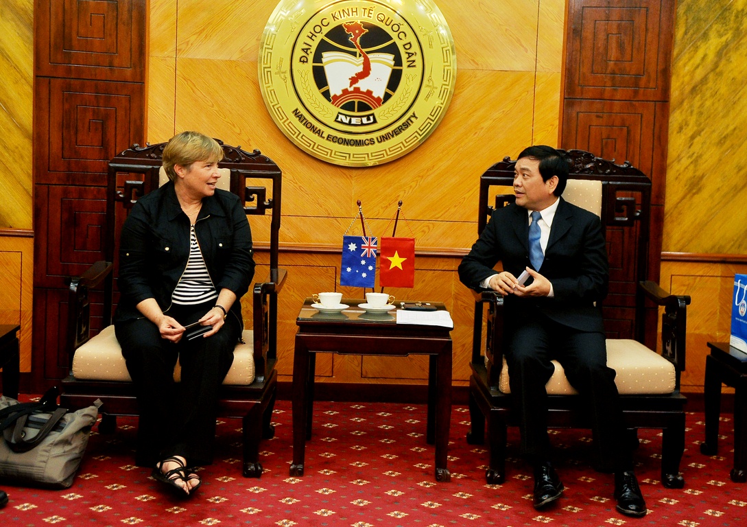 Sáng 11/3/2015, tại G2N10, GS.TS Trần Thọ Đạt – Hiệu trưởng, Bí thư Đảng ủy trường Đại học Kinh tế quốc dân (ĐH KTQD) đã tiếp và làm việc với đoàn cán bộ trường Adelaide Business School – Úc. Tham gia buổi làm việc còn có PGS.TS Phạm Trương Hoàng – Trưởng phòng Hợp tác quốc tế. Về phía đoàn cán bộ của trường Adelaide Business School có TS. Jane Olsson – Quản lý Khu vực, phòng Hợp tác quốc tế và TS. Nam Nguyễn – giảng viên của trường. Những cơ hội hợp tác về đào tạo trong thời gian sắp tới là nội dung chính được hai bên đề cập và thảo luận tại buổi làm việc này.