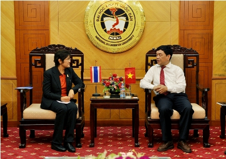 Trường Đại học Khon Kaen là trung tâm giáo dục và đào tạo lớn nhất vùng Đông Bắc của Thái Lan và được công nhận là trường đại học đi đầu trong việc đổi mới phương pháp giảng dạy, học tập và nghiên cứu trong khu vực. Sau thành công của Hội thảo khoa học Quốc tế do hai Trường phối hợp tổ chức lần đầu tiên tại Trường Đại học Kinh tế Quốc dân vào tháng 3 năm 2013, Ban lãnh đạo và đại diện hai trường tiếp tục thảo luận về công tác tổ chức Hội thảo khoa học Quốc tế với chủ đề “Khoa học Xã hội và Nhân văn vì mục tiêu phát triển” tại Khon Kaen vào tháng 11 năm 2013 cũng như việc ký kết Biên bản ghi nhớ phát triển thêm các quan hệ hợp tác giữa hai bên.
