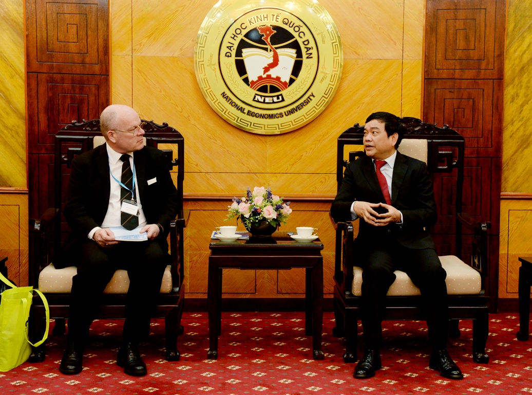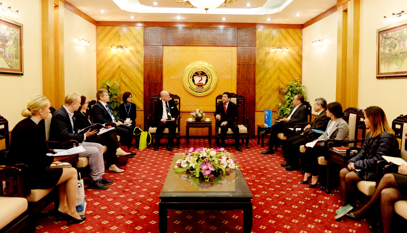 Chào mừng Đoàn tới thăm và làm việc, GS.TS Trần Thọ Đạt cũng dành thời gian giới thiệu đôi nét về trường Đại học Kinh tế quốc dân (NEU). Thành lập từ năm 1957, NEU đã có 60 năm hình thành, xây dựng và phát triển, là một trong những trường đại học lâu đời, có uy tín và chất lượng đào tạo hàng đầu ở Việt Nam. Trong hơn một thập kỉ trở lại đây, trường tập trung phát triển các chương trình hợp tác quốc tế và coi đó là một thế mạnh của mình. Hiện NEU có khoảng 150 đối tác trên toàn thế giới, với khoảng hơn 20 chương trình hợp tác, liên kết đào tạo 3+1, 2+2, 1+1…, trao đổi giảng viên, sinh viên, nhượng quyền đào tạo, thực tập thực tế…với nhiều doanh nghiệp lớn và trường đại học danh tiếng ở Mỹ, Canada, Anh, Pháp, Nhật, Hàn Quốc… Nhà trường đang tiếp tục đẩy mạnh mối liên kết tại các quốc gia khác như: Đức, Ý, Tây Ban Nha… Giáo sư Hiệu trưởng hi vọng, trong lộ trình phát triển này, Phần Lan sẽ trở thành một quốc gia có nhiều trường Đại học và Doanh nghiệp xây dựng mối quan hệ hợp tác với trường ĐH KTQD.