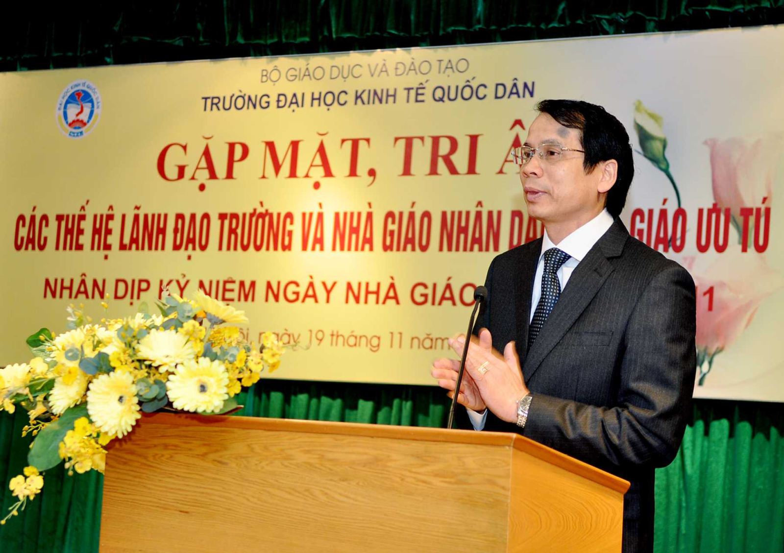 Phát biểu tại buổi lễ, thay mặt Đảng ủy, BGH đương nhiệm và tập thể sư phạm nhà trường, PGS.TS Phạm Mạnh Hùng – Thứ trưởng Bộ Giáo dục và Đào tạo kiêm Bí thư Đảng uỷ, Hiệu trưởng đã trân trọng bằng những lời tri ân sâu sắc nhất gửi đến các thế hệ Nhà giáo đang có mặt và không có điều kiện tham dự buổi lễ. Bí thư, Hiệu trưởng Phạm Mạnh Hùng khẳng định, Trường đại học KTQD ngày nay có truyền thống và bề dày phát triển gần 58 năm, thành quả và những thành tích lớn lao đạt được có sự đóng góp công sức quan trọng của các thế hệ Nhà giáo tận tâm với nghề nghiệp. Công lao đóng góp, sự tâm huyết nghề nghiệp của các Nhà giáo thuộc các thế hệ lãnh đạo, các NGND, NGUT tham gia giảng dạy và quản lý Nhà trường đã và đang là những tấm gương sáng, mẫu mực để cho đội ngũ Nhà giáo nói riêng, tập thể sư phạm hiện tại học tập và noi gương. Nhà trường hiểu rõ giá trị truyền thống, những nỗ lực và công sức tâm huyết vì Mái trường thân yêu của các thế hệ lãnh đạo, của các Nhà giáo đi trước, để rồi luôn biết ơn và ghi nhận sâu sắc những điều đó. Sự phát triển Nhà trường trong quá trình đổi mới và trong điều kiện hiện nay, bên cạnh những thuận lợi còn nhiều thách thức, thế hệ hiện tại hiểu rằng bên cạnh sự nỗ lực, còn có trách nhiệm kế thừa và phát huy những kinh nghiệm quý giá về công tác quản lý, kinh nghiệm giảng dạy, kinh nghiệm về sự mẫu mực người Thầy,vv… của các thế hệ đi trước; để rồi tiếp tục hoàn thiện mình, hoàn thành những nhiệm vụ đặt ra để đổi mới và hội nhập, đưa trường Đại học KTQD phát triển lên tầm cao mới xứng đáng với những đóng góp công sức không mệt mỏi của nhiều thế hệ lãnh đạo, của các Nhà giáo, đội ngũ CNV trường trong suốt chiều dài thời gian gần58 năm qua.