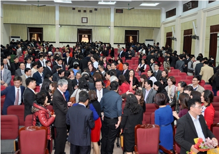 Ngay từ rất sớm, không khí trong Hội trường đã được hâm nóng bởi những lời chúc mừng một mùa xuân mới tràn đầy sức khỏe, may mắn, thành công và hạnh phúc! Những cái bắt tay xiết chặt, những cái ôm nồng ấm hòa quyện cùng tiếng cười, ánh mắt tươi vui trên gương mặt mỗi người. Cả Hội trường và các sảnh bên đều đầy ắp người tham dự.