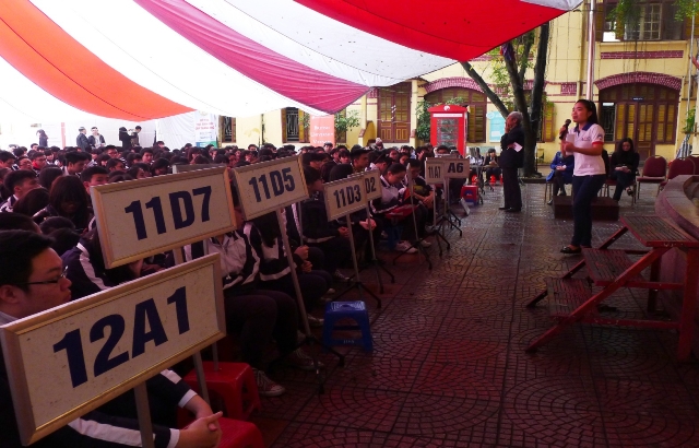 Quang cảnh sân trường THPT chuyên Lê Hồng Phong, Nam Định trong ngày tư vấn tuyển sinh