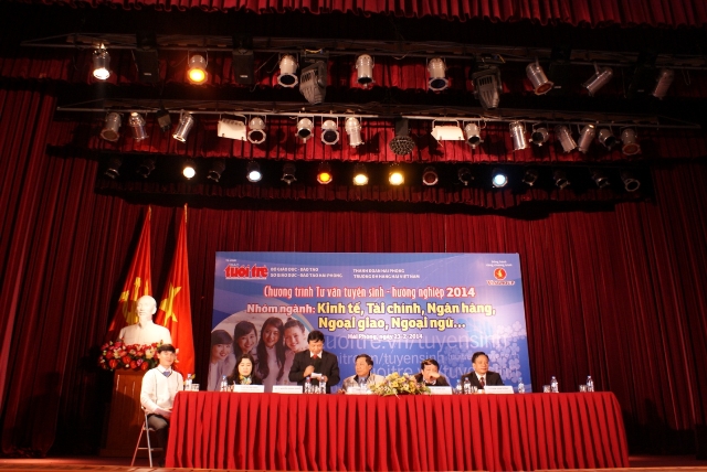 Sáng sớm ngày 23/2, Đoàn công tác với trưởng đoàn là GS.TS Nguyễn Quang Dong đã có mặt tại Thành phố Hải Phòng để tham gia chương trình Tư vấn tuyển sinh – hướng nghiệp 2014 do Bộ Giáo dục và Đào tạo, Sở GDĐT Hải Phòng, phối hợp với Báo Tuổi trẻ và Thành đoàn Hải Phòng tổ chức tại Đại học Hàng Hải. Với sự góp mặt của khoảng 3000 bạn học sinh từ các trường THPT trên địa bàn thành phố Hải Phòng, chương trình không chỉ là dịp để Đại học Kinh tế quốc dân giới thiệu thông tin tuyển sinh mà còn là một cơ hội tốt để Trường giới thiệu hình ảnh, tạo ấn tượng tốt với đông đảo các ứng viên tiềm năng đến từ thành phố hoa phượng đỏ.
