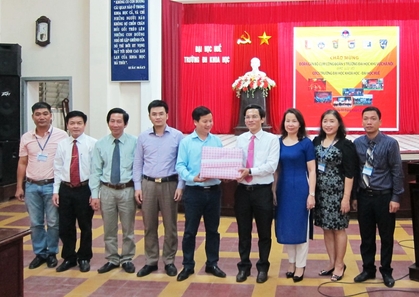Bên lề của hội nghị, chiều ngày 8/4, cụm 5 trường đã đến thăm và làm việc với lãnh đạo, công đoàn trường Đại học Khoa học – Đại học Huế. Cụm 5 trường đã được đón tiếp chu đáo, được trao đổi chia sẻ kinh nghiệm trong hoạt động nhà trường nói chung và hoạt động công đoàn các trường nói riêng.