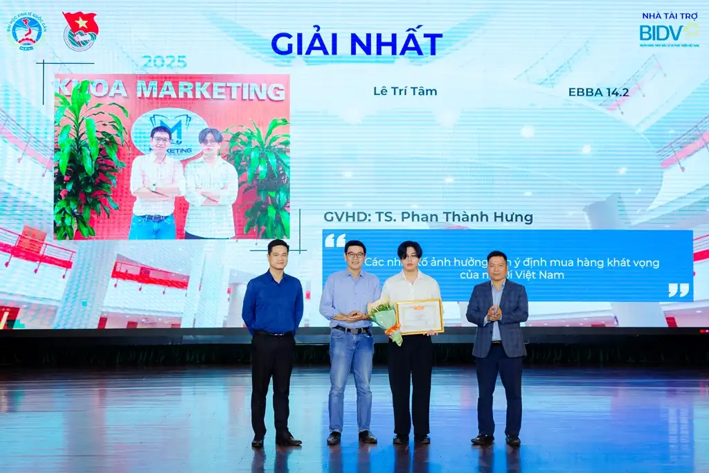 GS.TS Nguyễn Thành Hiếu ghi nhận và biểu dương những kết quả nổi bật trong hoạt động nghiên cứu khoa học sinh viên thời gian qua, khi các công trình ngày càng có tính ứng dụng cao, gắn với thực tiễn kinh tế – xã hội, nhiều sản phẩm được công bố trên các tạp chí và kỷ yếu uy tín trong nước và quốc tế; Đồng thời đánh giá cao sự nỗ lực của đội ngũ giảng viên hướng dẫn, các đơn vị đào tạo, phòng ban chức năng và tổ chức Đoàn Thanh niên trong việc thúc đẩy và lan tỏa phong trào nghiên cứu trong sinh viên.