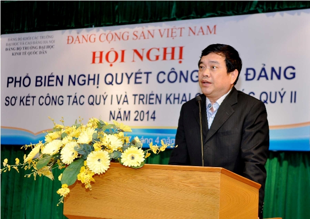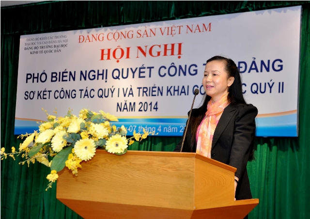 Sau phần khai mạc, đồng chí Trần Thọ Đạt – Phó Bí thư Đảng ủy, Phó Hiệu trưởng đã thay mặt cho Đảng ủy phổ biếnnội dung Nghị quyết công tác Đảng quý 2 năm 2014. Trong phần trình bày Đồng chí Trần Thọ Đạt đã làm nổi bật kết quả lãnh đạo của Đảng ủy Trường trong quý I/2014. Điển hình là: Tiếp tục thực hiện Chỉ thị 03-CT/TW về đẩy mạnh việc học tập và làm theo tấm gương đạo đức Hồ Chí Minh; Lãnh đạo ổn định tình hình giảng dạy, học tập học kỳ 1; Tăng cường công tác thanh tra, kiểm tra các khâu: giảng dạy, học tập, quản lý và phục vụ; Xây dựng kế hoạch tuyển sinh năm 2014; Triển khai các chương trình nghiên cứu, các đề tài khoa học đã được phê duyệt; Giới thiệu và tổ chức đăng ký thực hiện nhiệm vụ khoa học – công nghệ năm 2015; Tổ chức và triển khai tốt các hoạt động hợp tác quốc tế; Tiếp tục thực hiện Nghị quyết của Đảng ủy về đẩy nhanh tiến độ xây dựng Nhà Trung tâm đào tạo; Triển khai và hoàn thành công tác quy hoạch cấp uỷ các cấp nhiệm kỳ 2015-2020 và các nhiệm kỳ tiếp theo của Đảng bộ Trường; Lãnh đạo các Chi bộ, các tổ chức chính trị – xã hội, cán bộ, giảng viên và sinh viên hưởng ứng các hoạt động chào mừng các ngày lễ và ngày kỷ niệm lớnnhư kỷ ngày thành lập Đảng3/2, ngày Quốc tế Phụ nữ 8/3, ngày thành lập Đoàn 26/3. Quan trọng nhất trong quý I vừa qua đó là Đảng ủy trường đã tập trung lãnh đạo thực hiện xong về cơ bản công tác bổ nhiệm, bổ nhiệm lại và kéo dài thời gian giữ chức vụ quản lý các cấp của nhiệm kỳ 2013 – 2018.