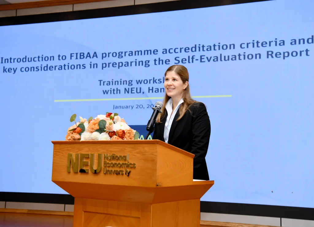 Tại Hội nghị, bà Nina Rotermund – Trưởng phòng Kiểm định quốc tế FIBAA, đã giới thiệu tổng quan về hệ thống tiêu chuẩn kiểm định FIBAA đối với chương trình đào tạo, làm rõ triết lý tiếp cận chất lượng dựa trên chuẩn mực châu Âu, lấy người học làm trung tâm và gắn chặt với yêu cầu của thị trường lao động.