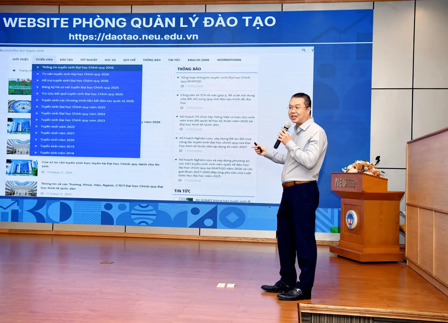 Ngày 08/4/2026, Đại học Kinh tế Quốc dân đã tổ chức Hội nghị thông tin tuyển sinh và triển khai công tác tư vấn tuyển sinh Đại học chính quy năm 2026.