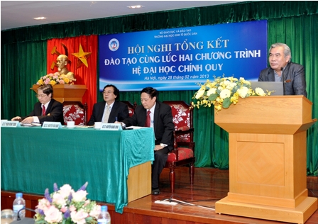 Tại Hội nghị, GS. TS. Nguyễn Quang Dong, Trưởng phòng QLĐT trình bày báo cáo tổng kết tổ chức đào tạo cùng lúc hai chương trình tại Trường. Báo cáo khẳng định: Tổ chức đào tạo cùng lúc hai chương trình là một chủ trương đúng đắn của Đảng uỷ, Ban Giám hiệu nhà trường. Mặc dù với thời gian 3 năm là rất ngắn, nhưng những kết quả thu được là to lớn trên các mặt: Đáp ứng tốt nhu cầu của xã hội; tiết kiệm chi phí đào tạo, tiết kiệm thời gian cho sinh viên; sử dụng tốt hơn cơ sở vật chất, đội ngũ giảng dạy của Trường; tích luỹ kinh nghiệm tạo bước đi ban đầu cho việc đa dạng hoá lọai hình, phương thức đào tạo, phù hợp với thông lệ quốc tế.