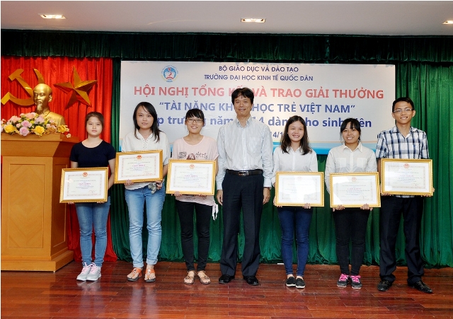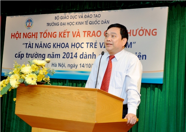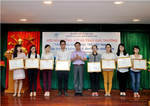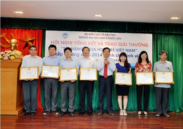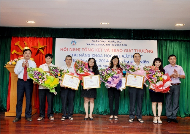 Vừa qua, Trường ĐH Kinh tế Quốc dân long trọng tổ chức Hội nghị Tổng kết và trao Giải thưởng “Tài năng khoa học trẻ Việt Nam” cấp Trường năm 2014. Đến tham dự hội nghị, về phía Bộ Giáo dục và Đào tạo có: TS. Vũ Thanh Bình – Phó Vụ trưởng Vụ Khoa học công nghệ và Môi trường – Bộ Giáo dục và Đào tạo; Về phía ĐH Kinh tế Quốc dân có: GS.TS. Trần Thọ Đạt – Hiệu trưởng Nhà trường, cùng lãnh đạo các tổ chức chính trị xã hội, lãnh đạo các phòng ban,  Khoa, Viện, Bộ môn, các giảng viên hướng dẫn và các sinh viên có công trình nghiên cứu khoa học trong năm 2014.