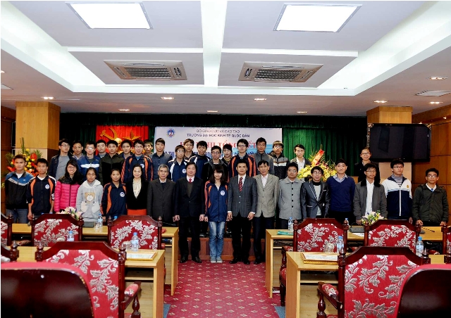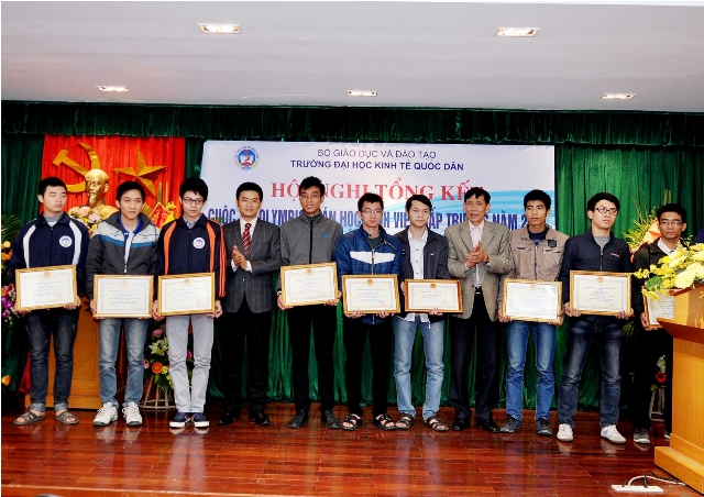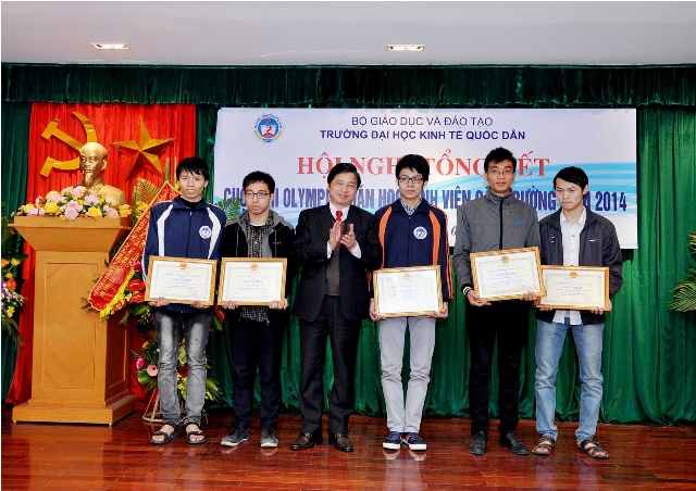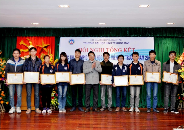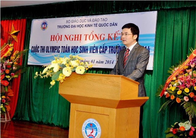 Mở đầu chương trình, Ths.Nguyễn Hoàng Hà – Trưởng phòng CTCT và QLSV, Bí thư Đoàn thanh niên thay mặt Ban tổ chức đã báo cáo tổng kết công tác triển khai và kết quả cuộc thi Olympic toán học cấp trường năm 2014. Báo cáo đã nêu bật và đánh giá cao những nỗ lực, những thành tích mà các em sinh viên đã đạt được. Năm nay, cuộc thi Olympic toán học cấp trường đã thu hút được hơn 400 sinh viên đăng ký trực tuyến, trong đó không chỉ sinh viên năm thứ 2,3 mà còn có rất nhiều sinh viên năm thứ nhất đăng ký tham dự. Điều này chứng tỏ các cuộc thi học thuật luôn là sân chơi bổ ích và thu hút đông đảo các bạn sinh viên yêu thích các môn khoa học tự nhiên tham dự. ThS.Nguyễn Hoàng Hà – Trưởng phòng CTCT và QLSV báo cáo tổng kết cuộc thi Olympic Toán học cấp trường năm 2014 Phát biểu tại buổi lễ, GS.TS. Phạm Quang Trung – Phó Hiệu trưởng – Trưởng Ban chỉ đạo cuộc thi đã ghi nhận và chúc mừng thành tích xuất sắc của các bạn sinh viên đạt giải trong cuộc thi và đánh giá cao công tác tổ chức của Phòng Công tác chính trị & Quản lý sinh viên cũng như những đóng góp đầy tâm huyết và chuyên môn của Cán bộ, Giảng viên khoa Toán Kinh tế, các phòng ban chức năng trong trường; đồng thời Giáo sư Phó Hiệu trưởng cũng kỳ vọng đội tuyển Olympic Toán sẽ tiếp tục đem lại những thành tích xuất sắc cho nhà trường trong cuộc thi Olympic Toán Quốc gia năm 2014 tại Đại học Phạm Văn Đồng – Quảng Ngãi trong thời gian tới, góp phần nâng cao chất lượng đào tạo của Nhà trường, nâng cao hình ảnh và uy tín của sinh viên Đại học Kinh tế Quốc dân không chỉ trong nước mà cả trong khu vực và trên thế giới. GS.TS. Phạm Quang Trung – Phó Hiệu trưởng trao giấy khen và phần thưởng cho các sinh viên đạt giải cao trong cuộc thi Olympic Toán học cấp trường