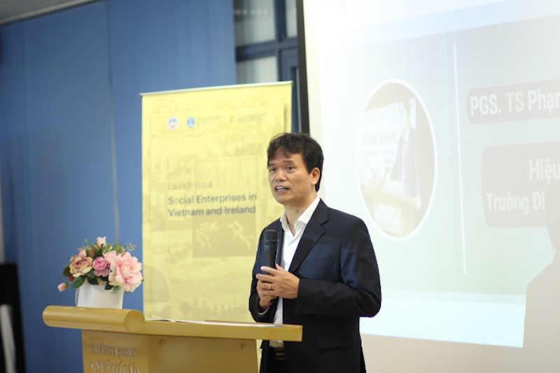Phát biểu khai mạc sự kiện, PGS.TS. Phạm Hồng Chương nhấn mạnh về việc lồng ghép sáng tạo xã hội, khởi nghiệp xã hội vào chiến lược phát triển chung của Nhà trường và vai trò của Trường Đại học Kinh tế Quốc dân thông qua Trung tâm Khởi nghiệp và Sáng tạo Xã hội trong việc thúc đẩy hệ sinh thái cho sáng tạo và doanh nghiệp xã hội tại Việt Nam, cùng sự cần thiết của việc trao đổi học thuật và thực hành giữa Việt Nam và các nước khác trong đó đặc biệt Ireland và Trường ĐH Trinity College Dublin – một người bạn mới của Nhà trường và CSIE. PGS.TS Phạm Hồng Chương đánh giá cao chất lượng học thuật của cuốn sách “Doanh nghiệp xã hội tại Việt Nam và Ireland” được thực hiện bởi nhóm nghiên cứu đến từ hai Trung tâm Sáng tạo Xã hội của hai trường Đại học tại Việt Nam và Ireland. Cuốn sách đã cung cấp cái nhìn so sánh về hệ sinh thái doanh nghiệp xã hội cũng như khu vực doanh nghiệp xã hội nói chung tại hai quốc gia, đồng thời nghiên cứu tình huống 12 doanh nghiệp xã hội Việt Nam và 10 doanh nghiệp Ireland, đồng thời cho thấy rõ vai trò của khu vực doanh nghiệp xã hội với mục tiêu phát triển bền vững của mỗi quốc gia.