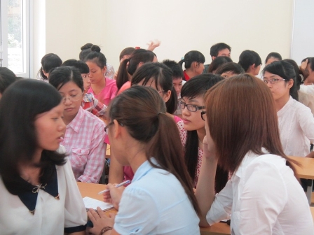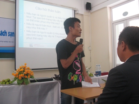 Không chỉ dừng lại ở việc chia sẻ, Hội thảo còn dành ra một khoảng thời gian cho các bạn sinh viên được áp dụng ngay những điều vừa tiếp nhận vào một bài tập tình huống nhỏ từ chính trải nghiệm thật của bà Nguyễn Mai Lệ. Tình huống được đưa ra rất gần gũi với các sinh viên ngành Du lịch; nó đòi hỏi các bạn phải đưa ra được nguyên nhân và hướng giải quyết cho tình trạng quá tải khách du lịch dưới góc độ của người bán tour, người điều hành tour và người quản lý resort. Sự đa dạng này đã khiến các sinh viên vô cùng hứng thú, kích thích các bạn phải vận dụng tối đa cả kiến thức chuyên ngành được bồi dưỡng trong nhiều năm lẫn những điều các bạn vừa được chia sẻ nhằm đưa ra những lời giải thích hợp tình, hợp lý nhất. Ngoài việc tham gia thảo luận bài tập tình huống, các sinh viên còn được tạo thêm cơ hội phát huy tính chủ động của mình bằng việc đặt câu hỏi cho các diễn giả. Rất nhiều các thắc mắc từ các sinh viên đã được các diễn giả giải đáp cặn kẽ: Biện pháp nâng cao năng suất làm việc của nhân viên trẻ, tìm việc thành công trong thời kỳ khủng hoảng, làm thế nào để thực tập hiệu quả, sử dụng mạng xã hội, cách giải quyết những câu hỏi khó khi phỏng vấn… Bằng cách này, Hội thảo đã xây dựng được mối tương tác từ cả hai phía – diễn giả và thính giả; khiến cho Hội thảo không những trở nên cởi mở hơn với sự phản ứng nhiệt tình từ phía các sinh viên mà còn khẳng định những tác động tích cực của phần chia sẻ đối với họ.