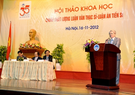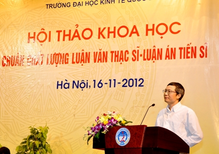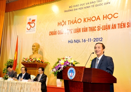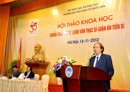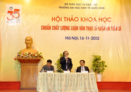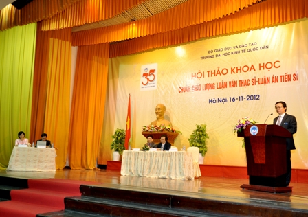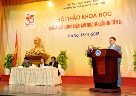 Nằm trong chuỗi hoạt động kỷ niệm 35 năm đào tạo sau đại học của trường ( 1977-20120), chào mừng ngày Nhà giáo Việt Nam 20-11, sáng nay ( 16/11), tại Hội trường A , Trường đại học Kinh tế quốc dân đã tổ chức hội thảo khoa học “ Chuẩn chất lượng luận văn thạc sĩ- luận án tiến sĩ”. Tham dự hội thảo có GS.TS, Nguyễn Văn Nam – Hiệu trưởng, các Phó Hiệu trưởng : GS.TS Trần Thọ Đạt, GS.TS Phan Công Nghĩa, GS.TS Phạm Quang Trung, Hội đồng khoa học đào tạo trường, đại diện lãnh đạo các đơn vị, các tổ chức đoàn thể . Tham dự hội thảo khoa học quan trọng này còn có gần 200 đại biểu là các nhà khoa học, các giảng viên, các nhà quản lý, những người tham gia vào quá trình hướng dẫn luận văn, luận án thạc sĩ, tiến sĩ của trường Đại học KTQD và nhiều trường đại học, viện nghiên cứu trong cả nước như : Đại học Ngoại thương, Đại học Thương mại, Đại học Bách khoa, Học viện Ngân hàng, Học viện Tài chính, Trường Đại học Kinh tế thành phố Hồ Chí Minh…