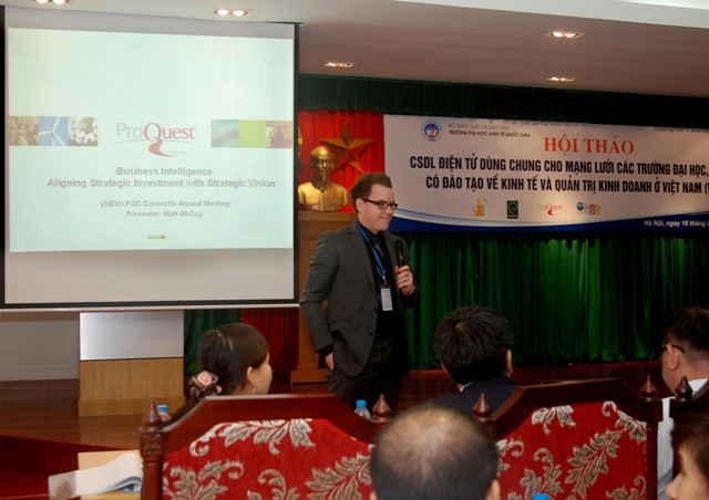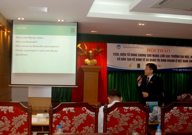Hội nghị cũng được nghe các ông : Amex Tan – nhà xuất bản Emerald, Matt Mecoy- nhà xuất bản ProQuets, Kevil Poh- nhà xuất bản OECD và bà Ngô Tố Hoa – đại diện iGroup giới thiệu thông tin, quảng bá sản phẩm, những lợi ích, giá trị cốt lõi, hiệu quả đích thực khi tham gia dùng những sản phẩm này vào cơ sở dữ liệu dùng chung của VNEUs.