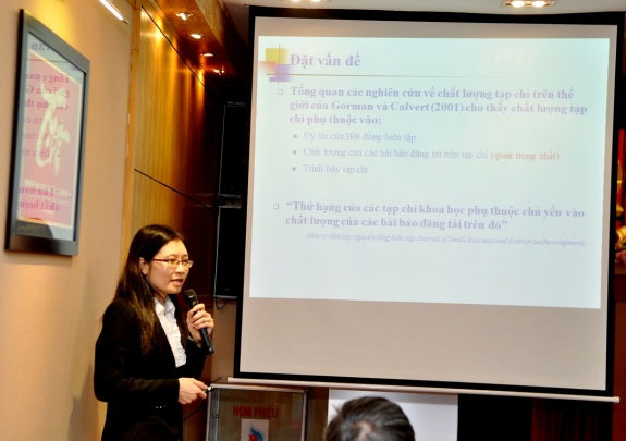 Trong phiên thứ nhất của hội thảo, các diễn giả đã lần lượt trình bày những kinh nghiệm nâng cao chất lượng tạp chí khoa học của các tạp chí khu vực ASEAN và Việt Nam. TS Đồng Xuân Đảm từ Trường đại học Kinh tế Quốc dân giới thiệu kinh nghiệm nâng cao chất lượng tạp chí khoa học thông qua các trung tâm trích dẫn quốc gia và khu vực của Thái Lan, Indonesia và Malaysia. PGS.TS Đinh Phi Hổ, Phó tổng biên tập Tạp chí Phát triển Kinh tế, Đại học Kinh tế Thành phố Hồ Chí Minh chia sẻ kinh nghiệm tình hình hoạt động của Tạp chí Phát triển Kinh tế và đi sâu vào công tác phát hành. Trong khi đó, TS. Bùi Thị Thủy từ Tạp chí Công nghệ và Đào tạo Ngân hàng, Học viện Ngân hàng, tập trung vào những khó khăn và thách thức mà các tạp chí khoa học kinh tế Việt Nam đang phải đối mặt.