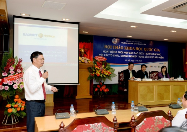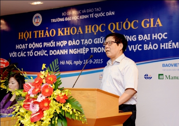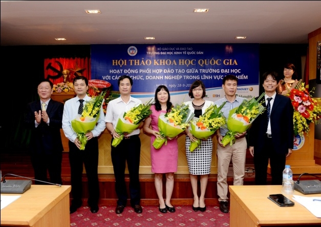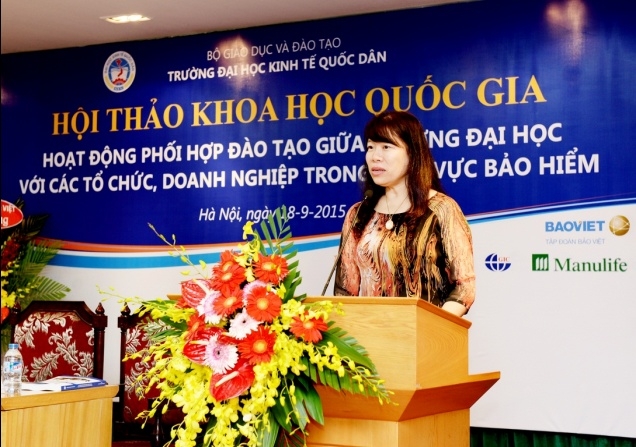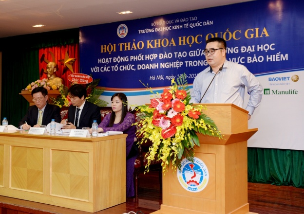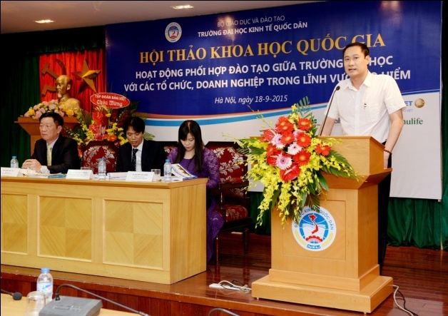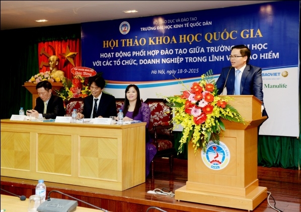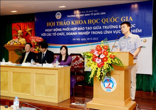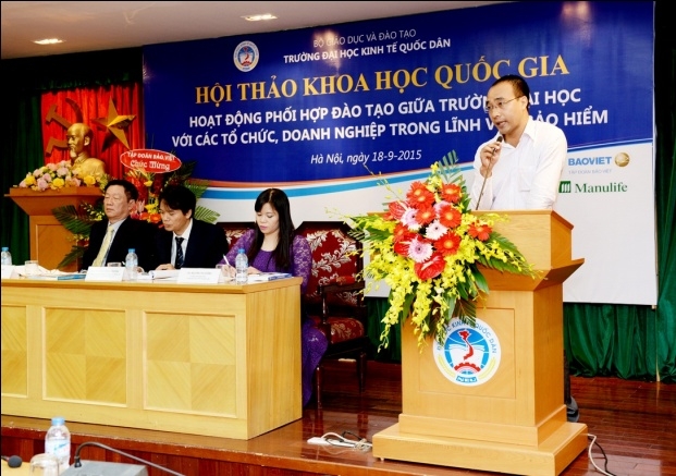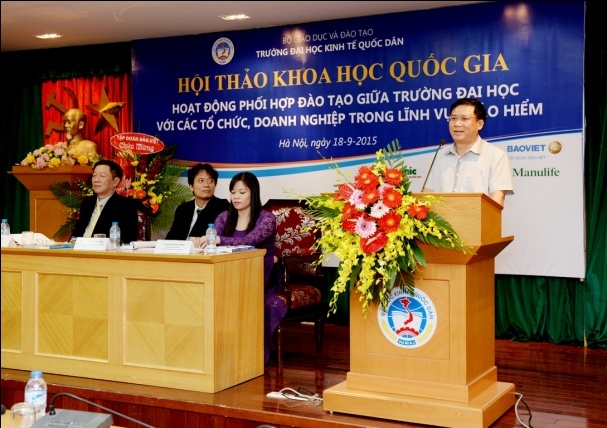 Sáng 18 tháng 9 năm 2015, tại G2.N10, Khoa bảo hiểm – Trường Đại học Kinh tế Quốc dân đã tổ chức hội thảo khoa học quốc gia với chủ đề: "Hoạt động phối hợp đào tạo giữa Trường Đại học với các tổ chức, doanh nghiệp trong lĩnh vực Bảo hiểm". Tham dự hội thảo, về phía các vị đại biểu, các nhà khoa học ngoài trường có Ông Ngô Việt Trung – Phó Cục trưởng Cục Quản lý giám sát Bảo hiểm – Bộ Tài Chính, Ông Phùng Đắc Lộc – Tổng Thư ký Hiệp hội Bảo hiểm Việt Nam, TS.Nguyễn Thanh Nga – Giám đốc Trung tâm Nghiên cứu và đào tạo Bảo hiểm Bộ Tài Chính, TS. Phí Trọng Thảo – Giám đốc Trung tâm đào tạo Bảo Việt, Ông Nguyễn Xuân Việt – Phó Tổng Giám đốc Tổng công ty Bảo hiểm Bảo Việt, Ông Trịnh Anh Tuấn – Phó Tổng giám đốc Tổng công ty Bảo hiểm PVI, Ông Đỗ Văn Hải – Tổng Giám đốc Tổng công ty Bảo hiểm Sài Gòn – Hà Nội, Ông Vũ Minh Hải – Phó Tổng Giám đốc Tổng công ty Bảo hiểm BIDV, Ông Lương Quang Ban – Phó Chủ tịch Công ty Bảo hiểm nhân thọ Great Eastern, Ông Đặng Hữu Lập – Phó Tổng Giám đốc công ty môi giới Bảo hiểm Nam Á, Ông Vũ Chí Huy – Phó Tổng Giám đốc Sở giao dịch Bảo hiểm Toàn Cầu phía Bắc, Ông Vũ Trung Thông – Giám đốc đối ngoại Khu vực Hà Nội – Đông Bắc và Tây Bắc – Công ty Prudential, TS.Nguyễn Thị Kim Nhã – Phó Giám đốc Ban tổ chức nhân sự và đào tạo – Tổng công ty cổ phần Bảo hiểm Bưu điện, Bà Nguyễn Thúy Hằng – Giám đốc nhân sự Tổng công ty cổ phần Bảo hiểm Quân đội, Bà Đặng Cẩm Thúy – Trưởng Phòng kinh doanh – Công ty TNHH Bảo hiểm Manulife Việt Nam, Bà Nguyễn Thanh Huyền – Trưởng phòng nhân sự công ty Bảo hiểm MSIG Việt Nam, Ông Nguyễn Văn Dũng – Chủ tịch Hội đồng Quản trị Công ty Giám định Smart, Ông Lê Hùng Sơn – Trưởng Ban Tổ chức Cán bộ Bảo hiểm xã hội Việt Nam, PGS.TS. Hoàng Mạnh Cừ – Phó Trưởng khoa Ngân hàng Bảo hiểm – Học viện Tài chính, TS. Hoàng Bích Hồng – Trưởng Khoa Bảo hiểm, Đại học Lao động và Xã hội và các đại biểu đến từ các cơ quan, doanh nghiệp bảo hiểm, các tác giả có bài đăng trên kỷ yếu hội thảo. Về phía trường Đại học Kinh tế Quốc dân có: PGS.TS Phạm Hồng Chương – Phó Hiệu trưởng, Phó Bí thư thường trực Đảng ủy; GS.TS Phạm Quang Trung – Phó Hiệu trưởng, Phó Bí thư Đảng ủy; PGS.TS. Hoàng Văn Cường – Phó Hiệu trưởng, GS.TS. Phan Công Nghĩa – Chủ tịch Hội đồng KH & ĐT, TS. Nguyễn Thị Chính – Trưởng Khoa Bảo hiểm cùng đại diện lãnh đạo các tổ chức chính trị – xã hội, các Phòng, Viện, Khoa, Trung tâm trực thuộc trường, các thầy cô giáo, nghiên cứu sinh, học viên cao học và sinh viên của Khoa Bảo hiểm. Hội thảo còn thu hút được sự quan tâm của các cơ quan thông tấn báo chí đến dự và đưa tin về hội thảo. Phát biểu khai mạc hội thảo, PGS.TS. Phạm Hồng Chương – Phó Hiệu trưởng Đại học Kinh tế Quốc dân đã khẳng định: Trường Đại học kinh tế Quốc dân là một trong số ít cơ sở có đào tạo đại học và sau đại học ngành bảo hiểm có uy tín trong cả nước. Đến nay, ngành bảo hiểm đã đào tạo được hơn 4.000 cử nhân, hàng chục tiến sĩ và hàng trăm thạc sĩ, góp phần không nhỏ vào sự phát triển của ngành bảo hiểm ở Việt Nam. Đã có rất nhiều cựu sinh viên và học viên ngành bảo hiểm của trường Đại học Kinh tế Quốc dân hiện đang đảm nhận các vị trí lãnh đạo chủ chốt trong các tổ chức và doanh nghiệp bảo hiểm trên phạm vi cả nước. Những thành tựu này có được là do sự cố gắng nỗ lực không ngừng của cả thầy và trò trường Đại học Kinh tế Quốc dân, bên cạnh đó còn có sự đóng góp của các tổ chức và doanh nghiệp trong việc phối hợp và hỗ trợ nhà trường trong quá trình đào tạo. Sự phối hợp đào tạo giữa trường đại học với các tổ chức và doanh nghiệp là nhu cầu khách quan xuất phát từ lợi ích của cả hai phía nhằm đáp ứng yêu cầu xã hội hóa giáo dục & đào tạo và là xu thế tất yếu của thời đại; và đề nghị các vị đại biểu cùng nhau trao đổi, thảo luận thẳng thắn trên tinh thần khoa học để đưa ra những kiến nghị và giải pháp nhằm nâng cao hiệu quả hoạt động phối hợp đào tạo giữa Nhà trường với các tổ chức, doanh nghiệp nói chung và trong lĩnh vực bảo hiểm nói riêng. Thay mặt Nhà trường và Ban tổ chức hội thảo, PGS.TS. Phạm Hồng Chương gửi lời cảm ơn chân thành đến các doanh nghiệp Bảo hiểm đã tài trợ cho hội thảo, cảm ơn Cục Quản lý giám sát bảo hiểm, Hiệp hội Bảo hiểm Việt Nam, các doanh nghiệp Bảo hiểm, các trường Đại học, Học viện, Trung tâm đào tạo Bảo hiểm và các nhà khoa học trong và ngoài trường đã tham gia viết bài và tham dự hội thảo. PGS.TS Phạm Hồng Chương và Ông Phùng Đắc Lộc tặng hoa cảm ơn các nhà Tài trợ TS. Nguyễn Thị Chính – Trưởng khoa Bảo hiểm ĐHKTQD trình bày báo cáo đề dẫn hội thảo Với mục tiêu khẳng