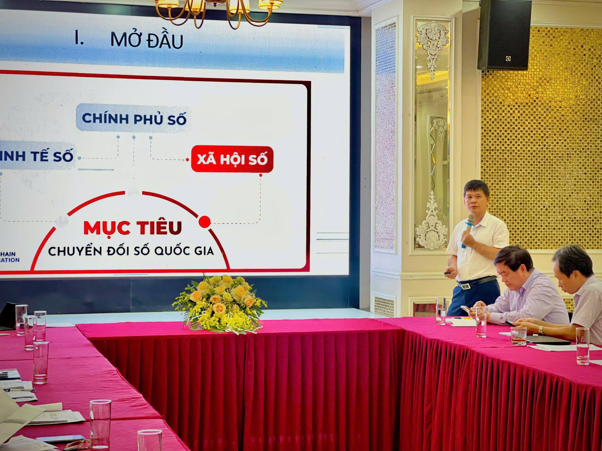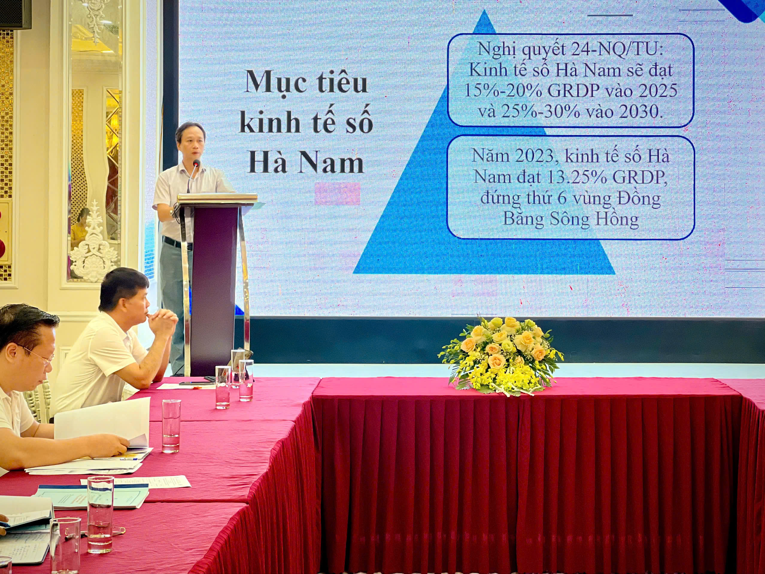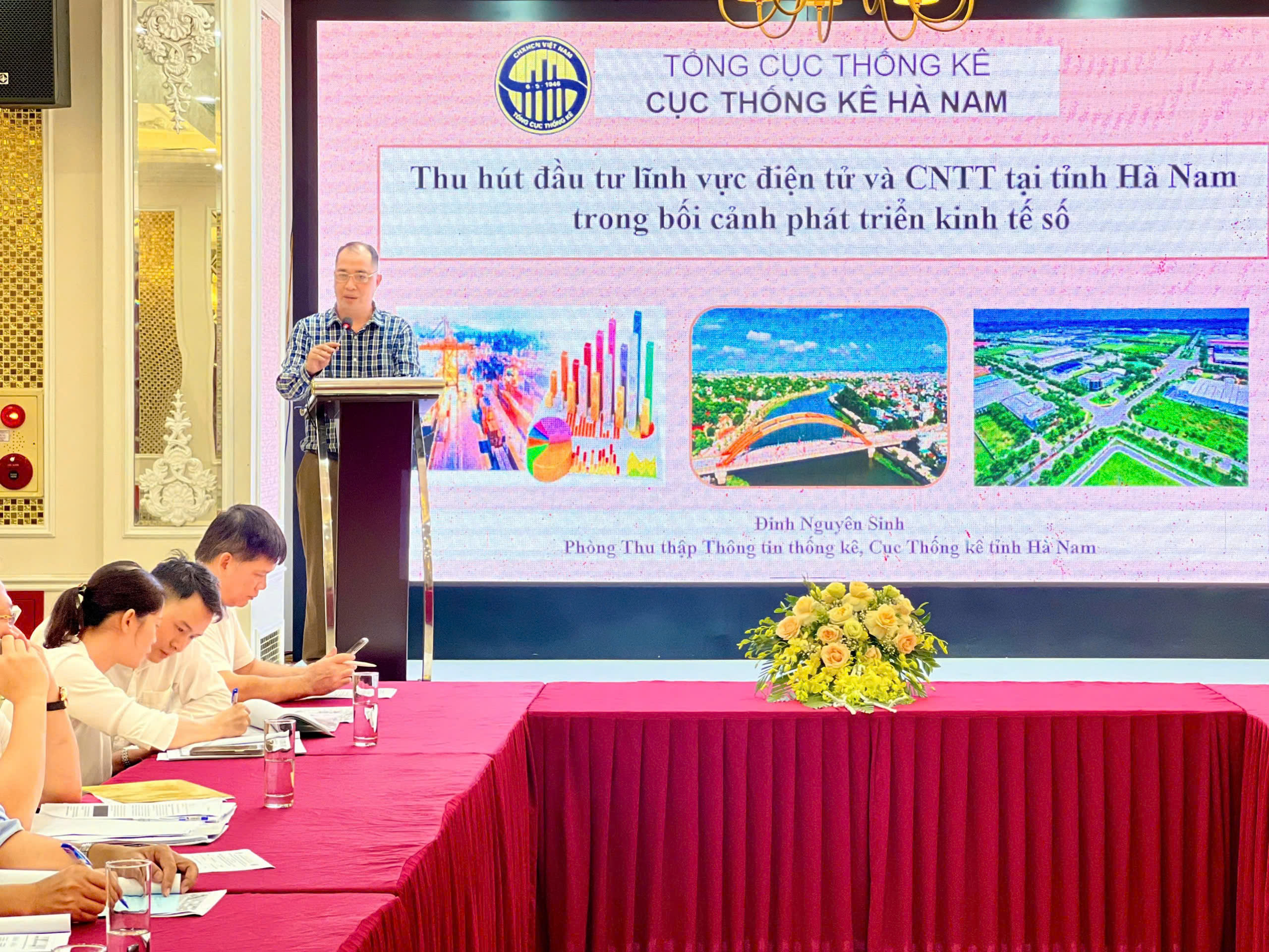 Diễn giả Đinh Nguyên Sinh – Phó trưởng phòng Phòng Thu thập thông tin, Cục Thống kê Hà Nam trình bày tham luận “Thu hút đầu tư lĩnh vực điện tử và CNTT tại tỉnh Hà Nam trong bối cảnh phát triển kinh tế số”