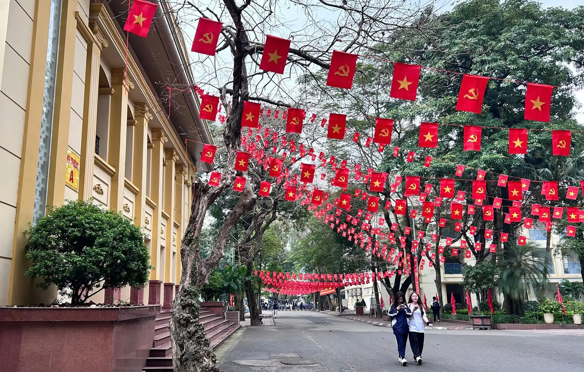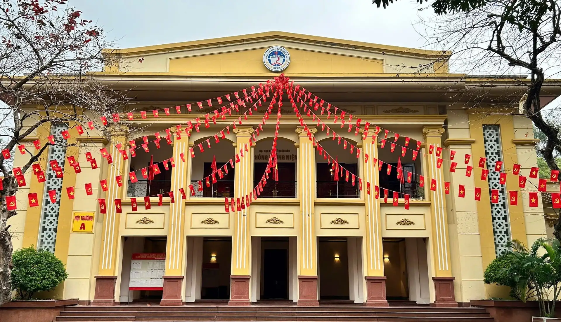 Khu vực bỏ phiếu trong khuôn viên Đại học Kinh tế Quốc dân được trang hoàng rực rỡ
