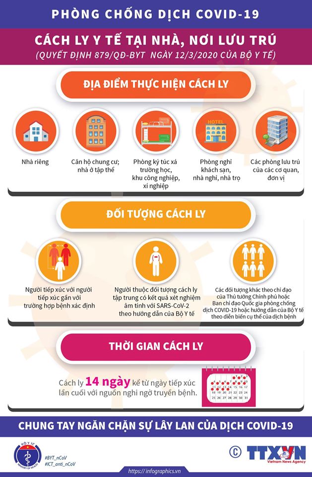 Bộ Y tế phối hợp Thông tấn xã Việt Nam đã xây dựng các infographics Hướng dẫn chi tiết các nội dung cách ly y tế tại nhà, nơi lưu trú bằng hình ảnh theo Quyết định số 879/QĐ-BYT ngày 12/3/2020 Hướng dẫn cách ly tại nhà, nơi lưu trú. Trân trọng giới thiệu đến người dân và cộng đồng.