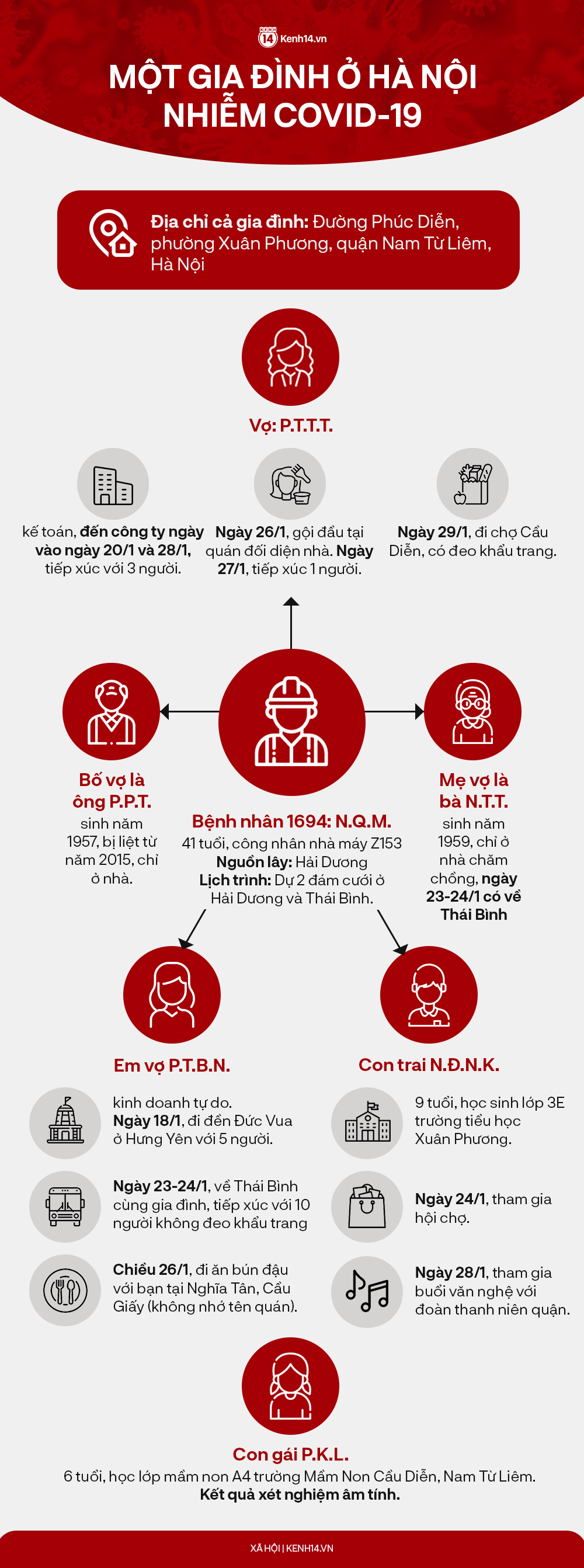 Bệnh nhân 1694 có lịch sử dịch tễ liên quan ổ dịch Hải Dương. Người này đã lây nhiễm cho 8 người, trong đó có 5 người trong gia đình gồm vợ, con trai, mẹ vợ, bố vợ và em vợ.
