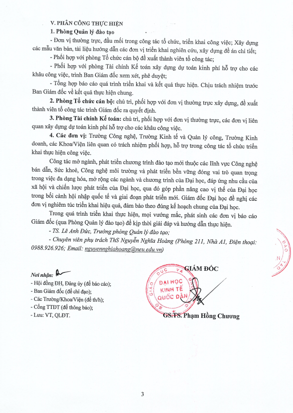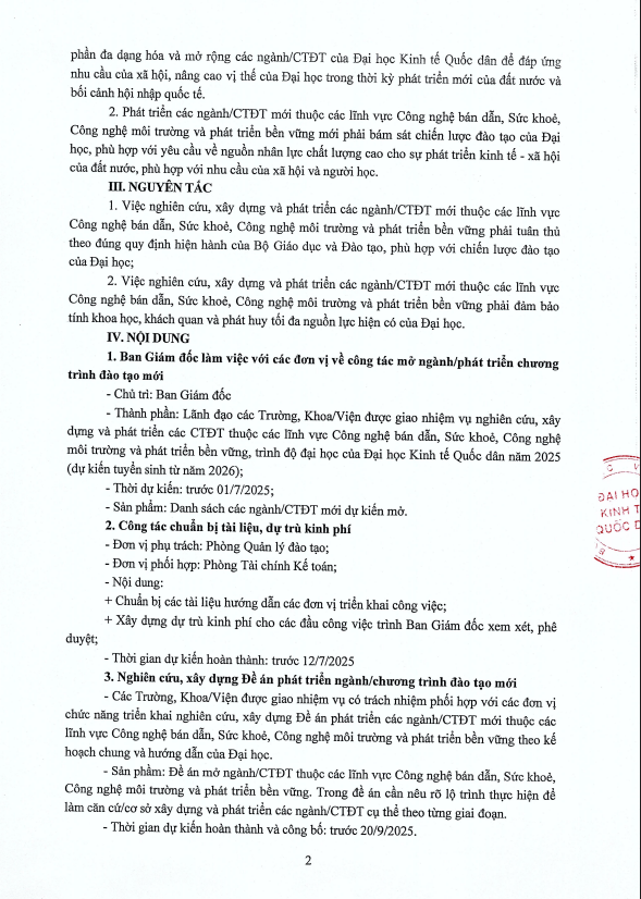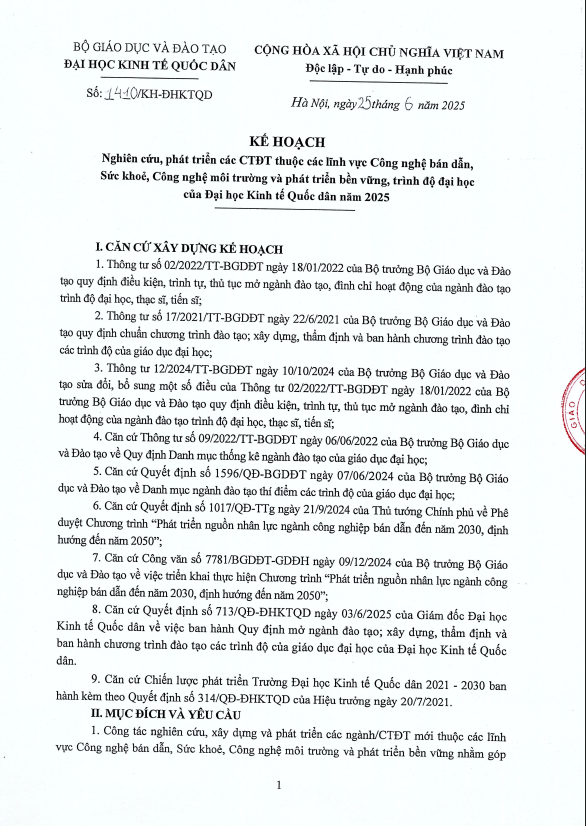 - Kế hoạch nghiên cứu, phát triển các chương trình đào tạo thuộc các lĩnh vực Công nghệ bán dẫn, Sức khoẻ, Công nghệ môi trường và phát triển bền vững, trình độ đại học của Đại học Kinh tế Quốc dân năm 2025