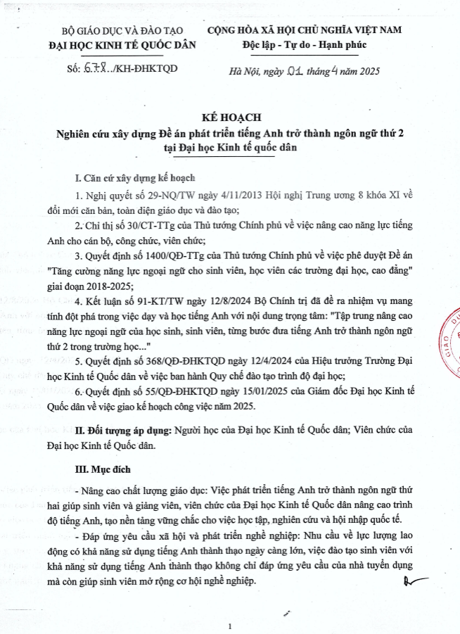 08/04/2025 2025-04-08 14:34Kế hoạch Nghiên cứu xây dựng Đề án phát triển tiếng Anh trở thành ngôn ngữ thứ 2 tại Đại học Kinh tế quốc dân