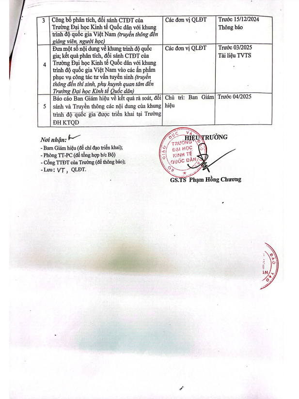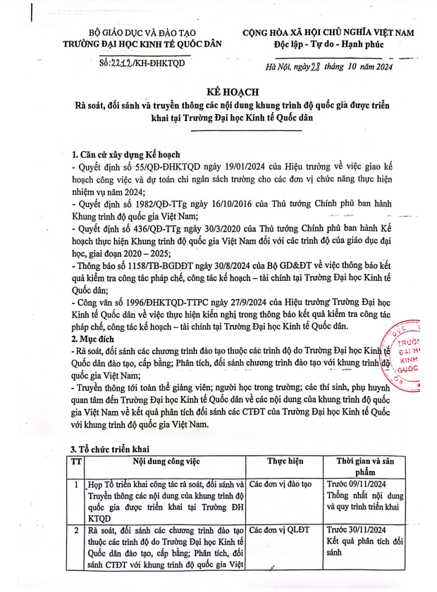 - Kế hoạch rà soát, đối sánh và truyền thông các nội dung khung trình độ quốc gia được triển khai tại Đại học Kinh tế Quốc dân