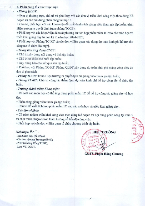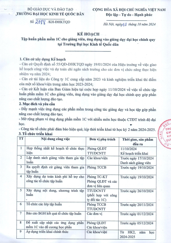 Kế hoạch tập huấn phần mềm 1C cho giảng viên, ứng dụng vào giảng dạy đại học Chính quy tại Trường Đại học Kinh tế quốc dân