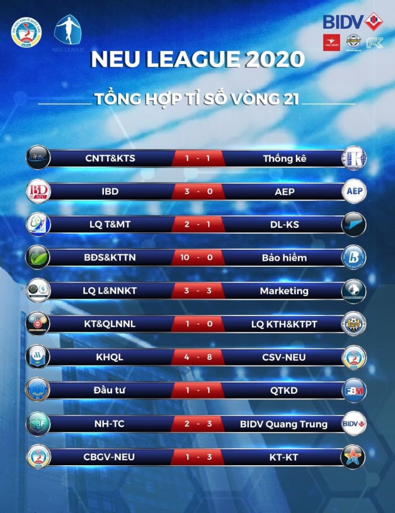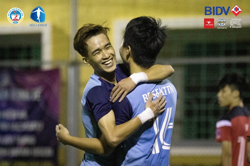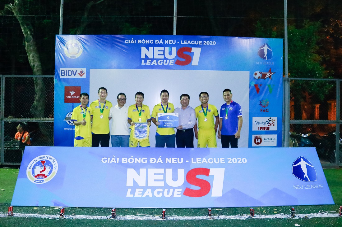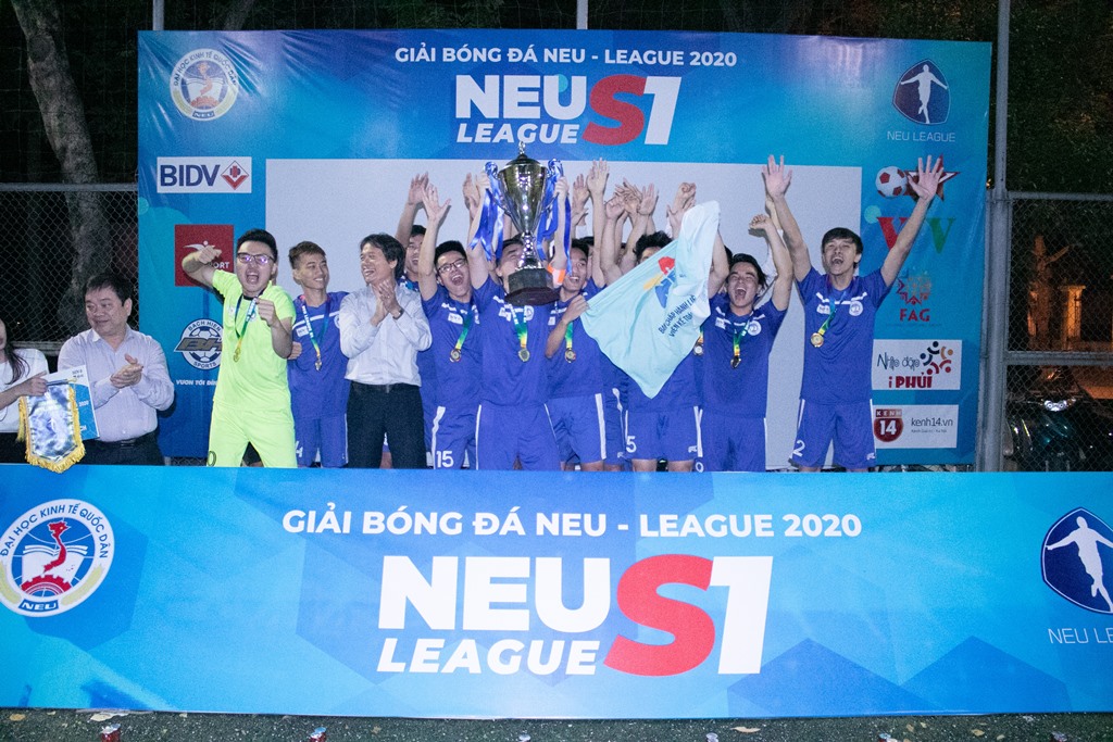 Sau 05 tháng tranh tài với hơn 200 trận đấu, cuối tuần vừa qua (10, 11/10/2020), giải bóng đá NEU – League 2020 do Trường đại học Kinh tế Quốc dân tổ chức đã kết thúc tốt đẹp với chức vô địch chung cuộc thuộc về BIDV Quang Trung và vô địch sinh viên thuộc về Viện Kế toán – Kiểm toán.