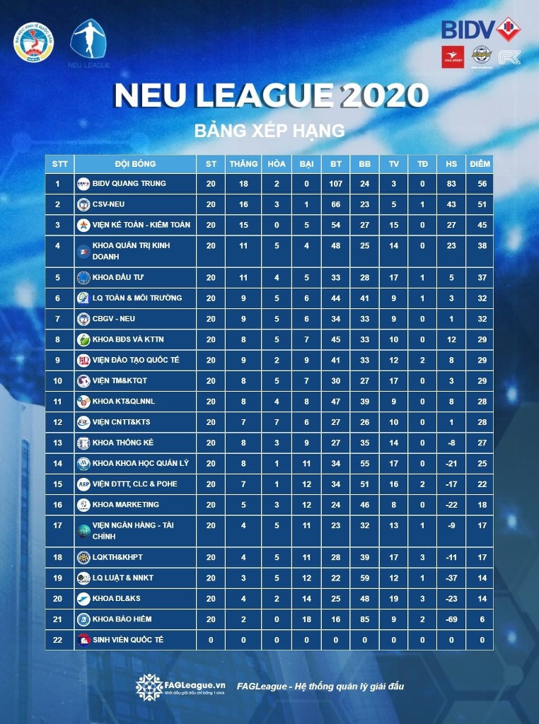 Kết quả chung cuộc giải bóng đá NEU – League 2020