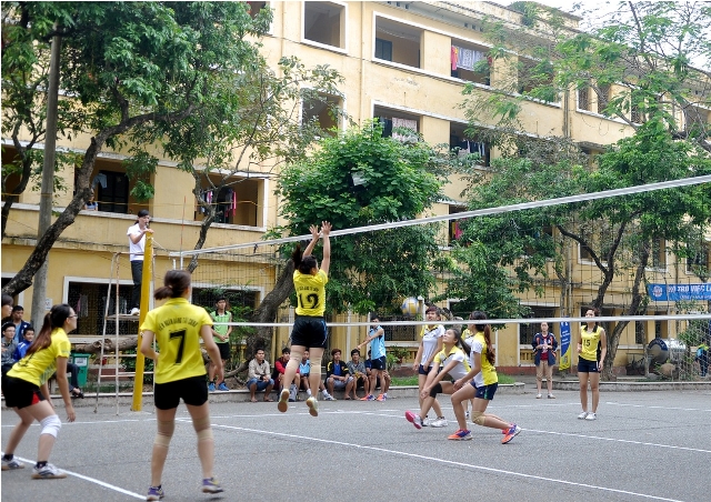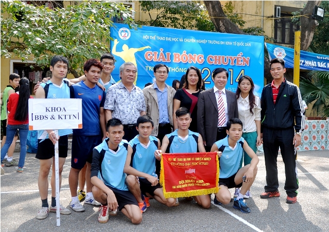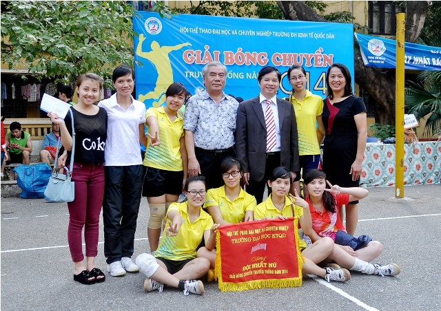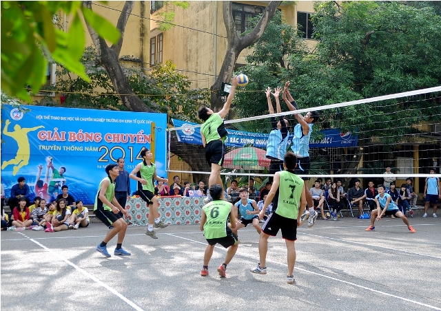 Thực hiện kế hoạch hoạt động của Hội Thể thao nhà trường năm 2014, được sự quan tâm tạo điều kiện của Ban Giám hiệu trường ĐHKTQD, vừa qua Bộ môn Giáo dục thể chất phối hợp với các đơn vị phòng ban chức năng trong nhà trường tổ chức Giải bóng chuyền truyền thống năm 2014. Giải bóng chuyền là một trong các hoạt động thể thao  được tổ chức hàng năm nhằm phát triển phong trào tập luyện thể dục – thể thao trong nhà trường, cũng là hình thức để đánh giá chất lượng dạy và học của lớp chọn bóng chuyền các khóa và luôn luôn nhận được sự ủng hộ của đông đảo các đội bóng đến từ các khoa, viện, trung tâm trong nhà trường. Đến tham dự lễ khai mạc và bế mạc giải có GS.TS Phạm Quang Trung – Phó Hiệu trưởng, GS.TS Phan Công Nghĩa  – Chủ tịch Hội Thể thao ĐH&CN nhà trường và các đồng chí lãnh đạo các khoa, đơn vị trong nhà trường.