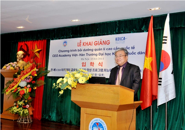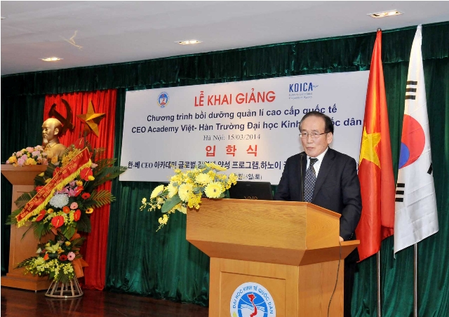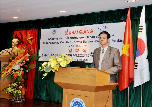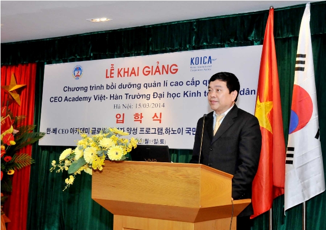 Phát biểu tại buổi lễ, GS.TS.Trần Thọ Đạt -Phó Hiệu trưởng nhà trường đãmột lần nữa khẳng định quan hệ Việt Nam và Hàn Quốc đã phát triển mạnh mẽ từ khi hai nước thiết lập quan hệ ngoại giao năm 1992. Mối quan hệ giữa hai nước được coi là hình mẫu điển hình trong quan hệ quốc tế, minh chứng cho mối quan hệ khăng khít cùng có lợi của hai quốc gia trên cả góc độ kinh tế và trao đổi văn hóa. Sự hiểu biết và tin tưởng lẫn nhau sẽ là cơ sở để cộng đồng doanh nghiệp hai nước tăng cường hợp tác, đầu tư, trao đổi thương mại và phát triển trong môi trường năng động này.GS.TS. Trần Thọ Đạtcũng đánh giá cao và tin tưởng,với sự tham gia của các giáo sư và nhà nghiên cứu hàng đầu về Quản trị doanh nghiệp, các chuyên gia nguyên là các lãnh đạo cấp cao của cơ quan Nhà nước, các giám đốc điều hành của các doanh nghiệp hàng đầu ở Hàn Quốc và Việt Nam, chương trình sẽ cung cấp những bài học mang tính hệ thống về chiến lược kinh doanh, nghiên cứu các ví dụ thực tế điển hình về sự thành công của các doanh nghiệp biết tạo dựng và đón đầu tương lai, học hỏi kinh nghiệm phát triển của các doanh nghiệp hàng đầu tại Hàn Quốc. GS. TS Trần Thọ Đạt cũng gửi lời cám ơn tới Đại sứ quán Hàn Quốc, Cơ quan Hợp tác Quốc tế Hàn Quốc (KOICA) trong khuôn khổ chương trình gửi chuyên gia tình nguyện, các cơ quan, doanh nghiệp có các cán bộ tham dự khóa học, các học viên đã thu xếp công việc và bố trí thời gian tham gia khóa học. Đây là một sự khích lệ lớn đối với chương trình và thể hiện sự tin tưởng đối với Trường Đại học Kinh tế Quốc dân.