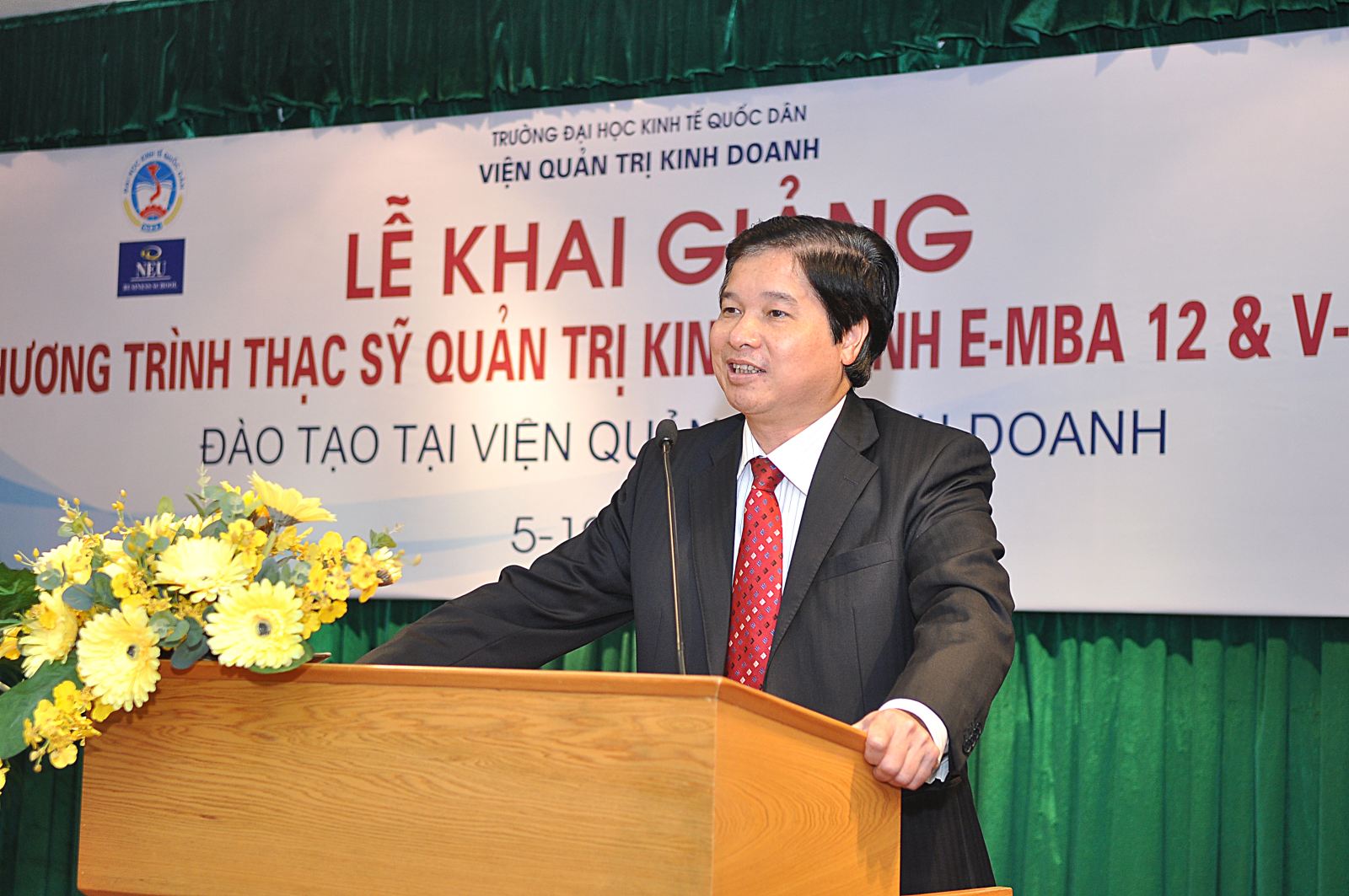 Phát biểu tại buổi lễ, GS.TS Phạm Quang Trung, Phó Hiệu trưởng nhà trường đã chúc mừng các tân học viên và đánh giá cao thành công của chương trình EMBA và VMBA “chương trình EMBA và VMBA mang lại lợi ích hết sức đặc biệt, đáp ứng cho yêu cầu hiện nay trong một thế giới phẳng và ngày càng phẳng hơn. Ngày hôm nay sức ép về cạnh tranh, sức ép về phát triển bền vững đang ngày càng tăng lên, nếu chúng ta không học tập, không hoàn thiện chính bản thân mình thì tuần sau chúng ta sẽ chậm một nhịp. Năng lực cạnh tranh của các doanh nghiệp, tổ chức phụ thuộc chủ yếu vào con người, vào trí tuệ, thông tin của mỗi con người trong doanh nghiệp, tổ chức. Chính vì vậy chúng ta phải học tập không ngừng. Chương trình EMBA và VMBA sẽ mang lại cho các anh/chị học viên ưu thế, năng lực cạnh tranh và khả năng phát triển bền vững của mỗi cá nhân nói riêng và của doanh nghiệp, tổ chức nói chung. Tham gia chương trình, học viên cao học sẽ có cơ hội được trau dồi về kiến thức, kỹ năng và đặc biệt là tạo lập và phát triển được mạng lưới quan hệ trong kinh doanh.”. Kết thúc bài phát biểu, GS.TS Phạm Quang Trung, phó hiệu trưởng nhà trường đã “Chúc toàn thể tân học viên và Viện Quản trị Kinh doanh có những thành thành công mới trên con đường  phát triển và nghiên cứu, đóng góp vào việc xây dựng trường đại học Kinh tế Quốc dân nói riêng và cộng đồng doanh nghiệp nói chung ”.