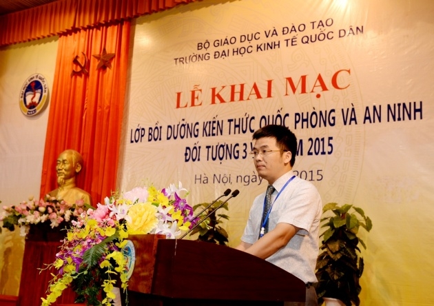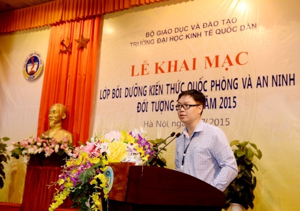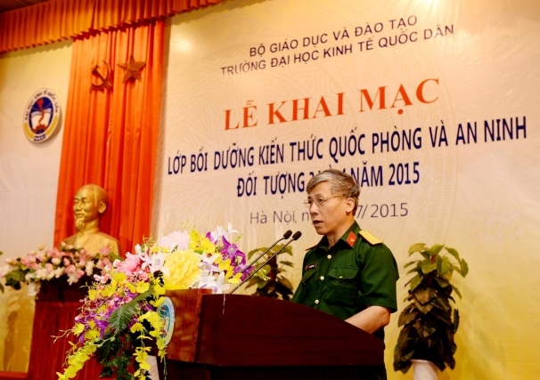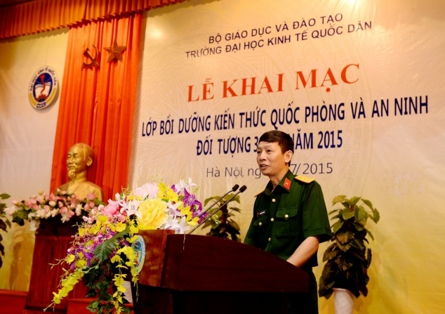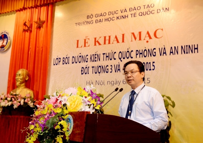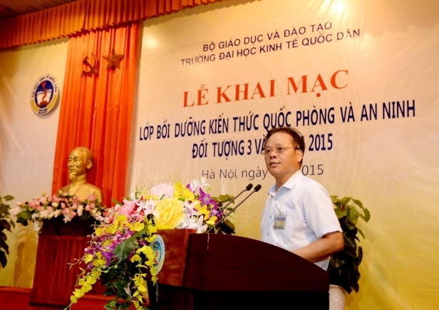Căn cứ công văn số 284/KH-BCH ngày 14/4/2015 của Ban chỉ huy quân sự Quận Hai Bà Trưng, căn cứ vào công văn số 666/KH-ĐHKTQD ngày 01/6/2015, sáng 06/6/2015, tại Hội trường A, trường Đại học Kinh tế Quốc dân đã khai giảng lớp Bồi dưỡng kiến thức quốc phòng và an ninh cho đối tượng 3 và 4 năm 2015. Tới dự buổi lễ, về phía các vị đại biểu ngoài trường có: Thượng tá Nguyễn Văn Cường – Chính trị viên Ban chỉ huy Quân sự Quận Hai Bà Trưng; Thiếu tá Nguyễn Minh Sơn – Trợ lý Ban Chỉ huy Quân sự quận Hai Bà Trưng; Đại tá, PGS.TS Phạm Gia Cư – giảng viên Học viện Chính trị. Về phía trường Đại học Kinh tế Quốc dân có GS.TS.Phạm Quang Trung – Phó Hiệu trưởng, Phó Bí thư Đảng ủy Trường; PGS.TS.Hoàng Văn Cường – Phó Hiệu trưởng, Trưởng Ban Chỉ huy Quân sự Trường,Trưởng ban chỉ đạo lớp bồi dưỡng; PGS.TS Nguyễn Thanh Hà, Trưởng phòng Tổ chức cán bộ cùng 166 học viên thuộc đối tượng 3 và 4 của lớp học.