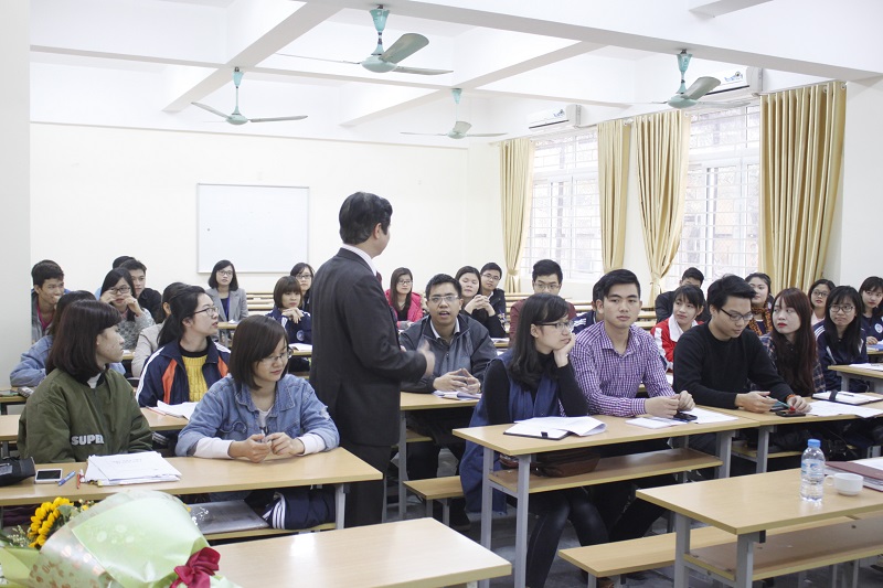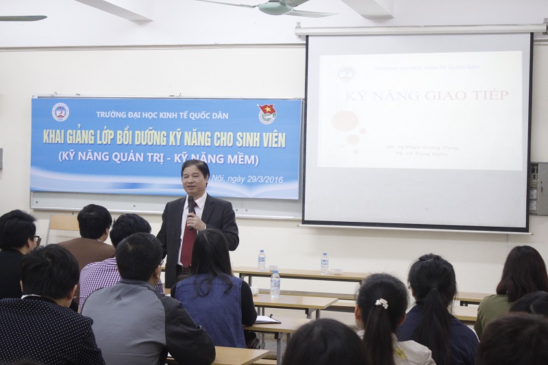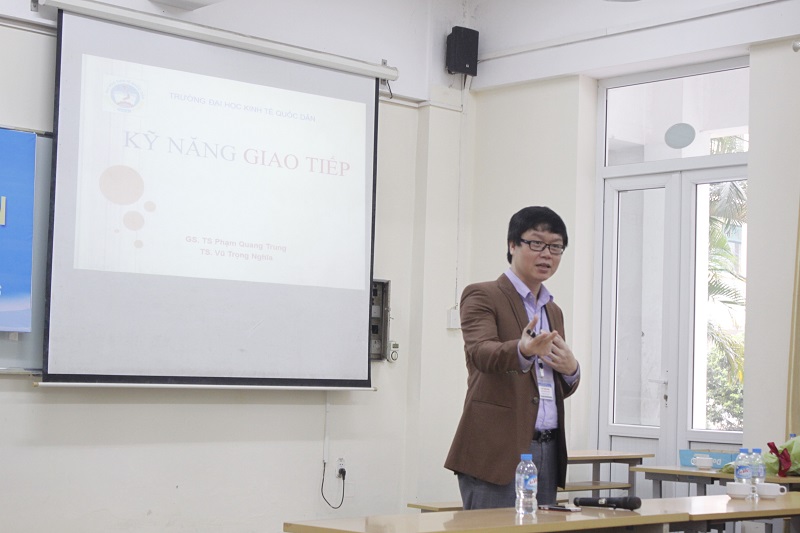 Điều đặc biệt của khóa học là các giảng viên tham gia giảng dạy đều là những thầy cô có nhiều năm kinh nghiệm và kiến thức thực tế về các chuyên đề như: GS.TS Phạm Quang Trung – Phó Bí thư Đảng ủy, Phó Hiệu trưởng Nhà trường, TS Vũ Trọng Nghĩa – Phó Trưởng phòng CTCT & QLSV, ThS Bùi Trung Hải – Bí thư Đoàn trường. Sau khi kết thúc bài phát biểu của GS.TS Phạm Quang Trung, các bạn sinh viên đã được học kỹ năng đầu tiên của khóa học – Kỹ năng giao tiếp. Kỹ năng giao tiếp là kỹ năng quan trọng và ứng dụng nhiều trong cuộc sống hàng ngày. Buổi học dưới sự giảng dạy của GS.TS Phạm Quang Trung và TS Vũ Trọng Nghĩa đã diễn ra hết sức sôi nổi. Các sinh viên được thực hành trực tiếp với những tình huống khác nhau, trong cả cuộc sống hàng ngày và công việc sau này.