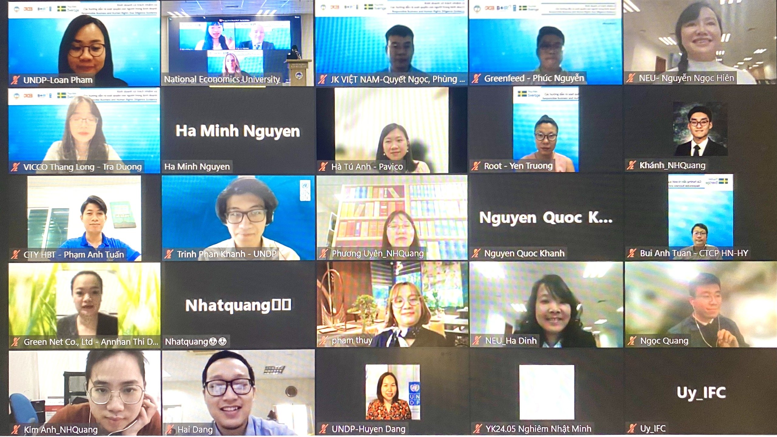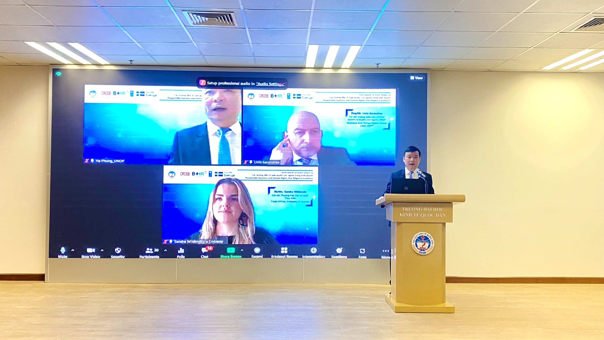 Sáng ngày 17/12/2021, tại Hội trường B101 Trường Đại học Kinh tế Quốc đã tổ chức khai mạc khóa Bồi dưỡng: “Kinh doanh có trách nhiệm và Các hướng dẫn rà soát quyền con người trong kinh doanh” thông qua hình thức online. Khóa học được tài trợ và phối hợp tổ chức bởi Chương trình phát triển Liên Hợp Quốc (UNDP) và Trường Đại học Kinh tế Quốc dân.