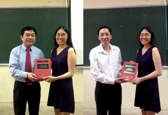 GS.TS Trần Thọ Đạt (trái) cùng PGS.TS. Trần Văn Nam đại diện nhận sách tặng từ GS. Xuân Thảo Nguyễn