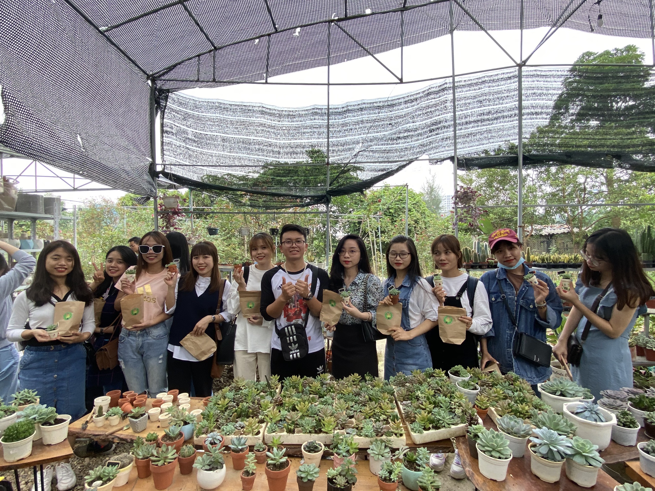 Điểm cuối cùng, đoàn đến thăm khu vườn nhỏ của anh Vũ Quang Huy – Cựu sinh viên Lớp Kinh tế – Quản lý Tài nguyên và Môi trường K52. Xuất phát từ tình yêu với cây cối hoa cỏ, năm 2017 cuộc thi ý tưởng và dự án khởi nghiệp dành cho sinh viên và giới trẻ trên địa bàn thành phố Hà Nội, Huy và Dự án Sambee – Xây dựng và phát triển chuỗi cửa hàng cây xanh Hạnh phúc là một trong bốn dự án xuất sắc nhất cuộc thi khởi nghiệp I-STARTUP. Với đam mê về lĩnh vực mình theo học, chủ động tìm kiếm thị trường, xây dựng hệ thống khách hàng, kích cầu qua việc hoàn thiện các sản phẩm mang tính thương mại hóa cao, giá cả hợp lý mang đến tay người tiêu dùng, phục vụ cộng đồng cư dân qua các mảng kinh doanh sản xuất, thương mại, trồng và chăm sóc khuôn viên cây xanh, Ban công hoa chung cư, nhà riêng, biệt thự, mảng xanh nhà hàng, quán cafe … Tại đây, các bạn sinh viên được trải nghiệm, tự tay trồng cây và mang về nhà những sản phẩm xinh xắn từ Sen Đá.