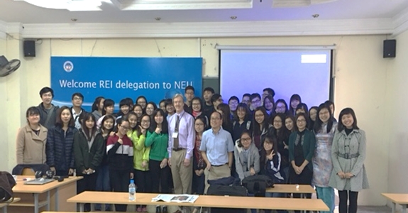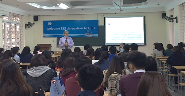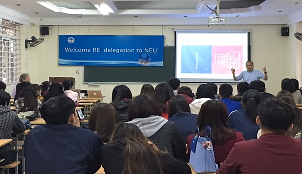 REI (Resource Exchange International) là tổ chức giáo dục phi lợi nhuận có mặt tại Việt Nam từ năm 1992 với mục tiêu "Xây dựng con người, xây dựng quốc gia", hợp tác với các nước trên thế giới trong đó có Viêt Nam nhằm hỗ trợ các lĩnh vực kinh tế, y tế, giảng dạy tiếng Anh và các vấn đề xã hội. Hòa cùng với không khí kỷ niệm 60 năm thành lập trường ĐH KTQD, đoàn REI với các diễn giả và các chuyên gia tư vấn từ các doanh nghiệp của Hoa Kỳ đã tới ĐH KTQD để thuyết trình và chia sẻ kinh nghiệm về 02 chủ đề: “International Business Communication” và “Adding values to our business propositions”.