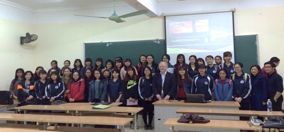 Sinh viên Khoa NNKT & chương trình tiên tiến chăm chú lắng nghe bài thuyết trình của diễn giả James Kang
