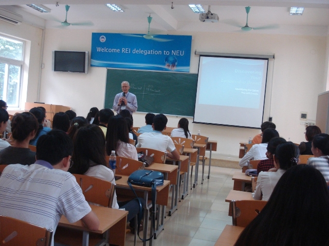 Sáng ngày 24 và 25 tháng 9 năm 2014, khoa Ngoại ngữ Kinh tế trường Đại học Kinh tế Quốc dân (ĐH KTQD) phối hợp với Tổ chức Hỗ trợ Nguồn lực Quốc tế tại Việt Nam (REI-Vietnam) đã tổ chức thành công buổi hội thảo chuyên đề của các chuyên gia kinh tế Hoa Kỳ. REI (Resource Exchange International) là một tổ chức phi chính phủ của Hoa Kỳ được thành lập từ năm 1990, hợp tác với các nước trên thế giới trong đó có Viêt Nam, để hỗ trợ trong các lĩnh vực kinh tế, y tế, giảng dạy tiếng Anh và các vấn đề xã hội. REI đến với ĐH KTQD như một hoạt động thường niên nhằm nâng tạo cơ hội tiếp cận thực tiễn doanh nghiệp, tổ chức nước ngoài cho sinh viên, nâng cao kiến thức, kinh nghiệm thực tế phục vụ công tác đào tạo và phát triển chuyên môn cho các giảng viên.