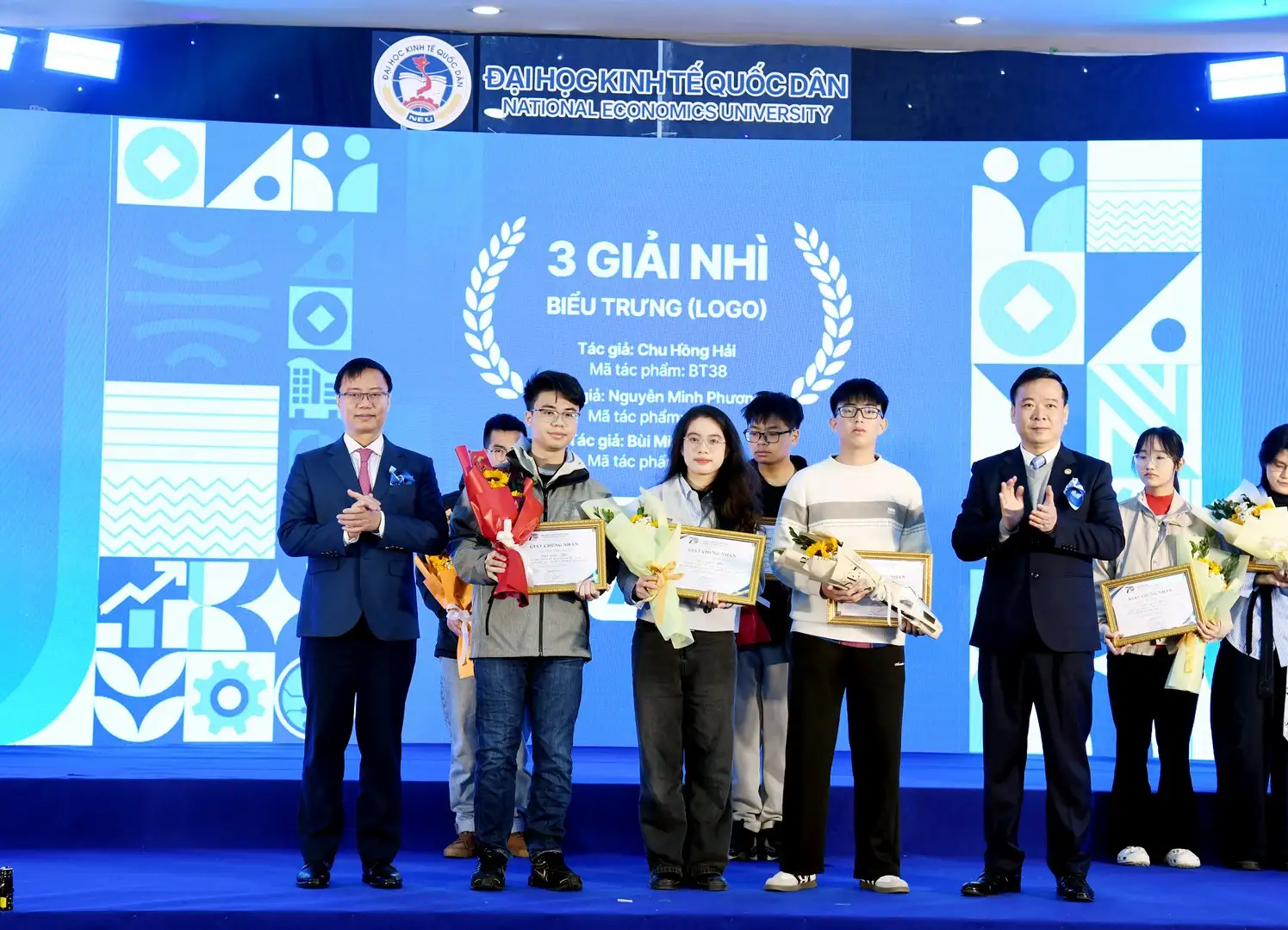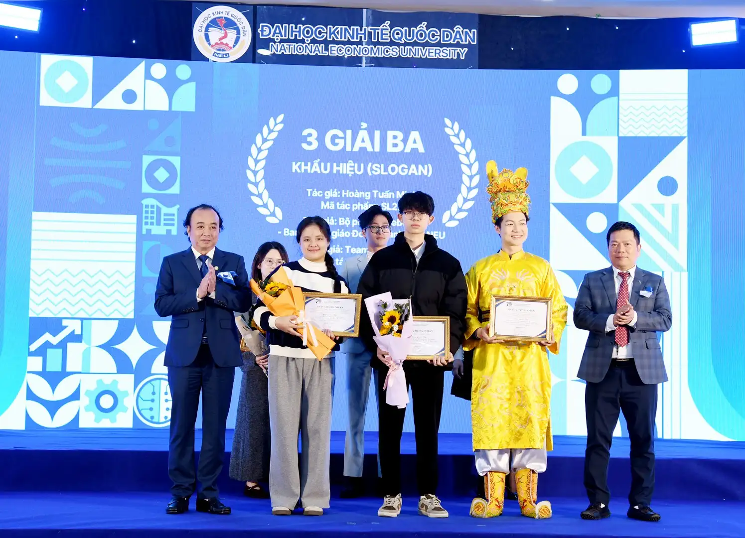 Lãnh đạo Đại học trao giải cho các tác giả đạt giải cuộc thi thiết kế Logo và Slogan chào mừng kỷ niệm 70 năm thành lập Đại học Kinh tế Quốc dân