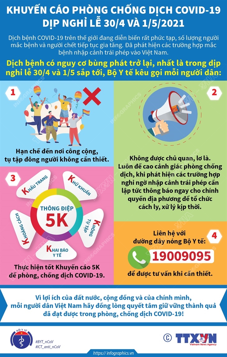 Dịch COVID-19 trên thế giới đang diễn biến phức tạp với số người mắc và người chết tiếp tục gia tăng. Việt Nam cũng đã phát hiện các trường hợp mắc COVID-19 nhập cảnh trái phép. Để ngăn chặn nguy cơ dịch bùng phát trở lại, nhất là dịp nghỉ lễ 30/4 và 1/5 sắp tới, Bộ Y tế kêu gọi mỗi người dân chủ động thực hiện các biện pháp phòng chống dịch bệnh.