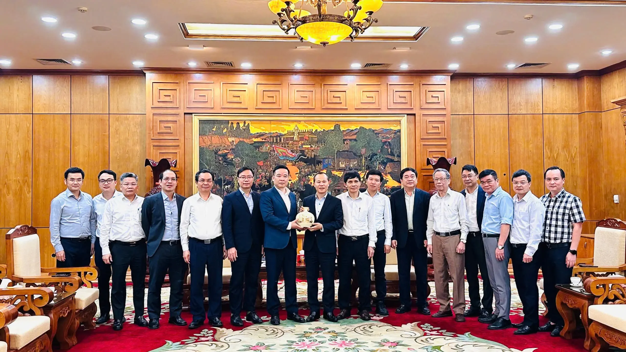 Lãnh đạo Đại học Kinh tế Quốc dân trao quà và chụp ảnh lưu niệm cùng các đồng chí lãnh đạo tỉnh Bắc Ninh
