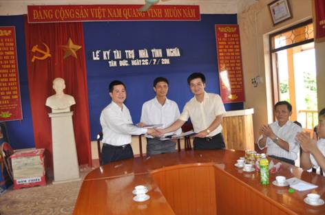 Đoàn trường Đại học Kinh tế Quốc dân; Đoàn thanh niên sở Giao dịch 1 Ngân hàng BIDV và Đoàn xã Tân Đức cùng ký kết tài trợ. |