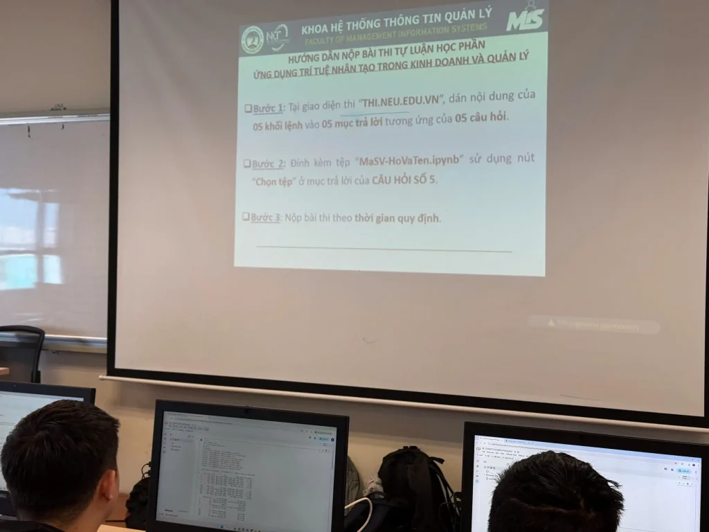 Trong buổi thi sáng 24/11, hai học phần thuộc Trường Công nghệ được đưa vào triển khai, gồm học phần “Ứng dụng trí tuệ nhân tạo trong kinh doanh và quản lý” với 88 sinh viên tham gia và học phần “Lập trình hướng đối tượng” với 193 sinh viên tham gia. Từ 7 giờ sáng, tổng cộng 281 sinh viên đã có mặt tại giảng đường để thực hiện các thủ tục check-in, ổn định chỗ ngồi và kiểm tra máy tính trước khi bước vào làm bài.